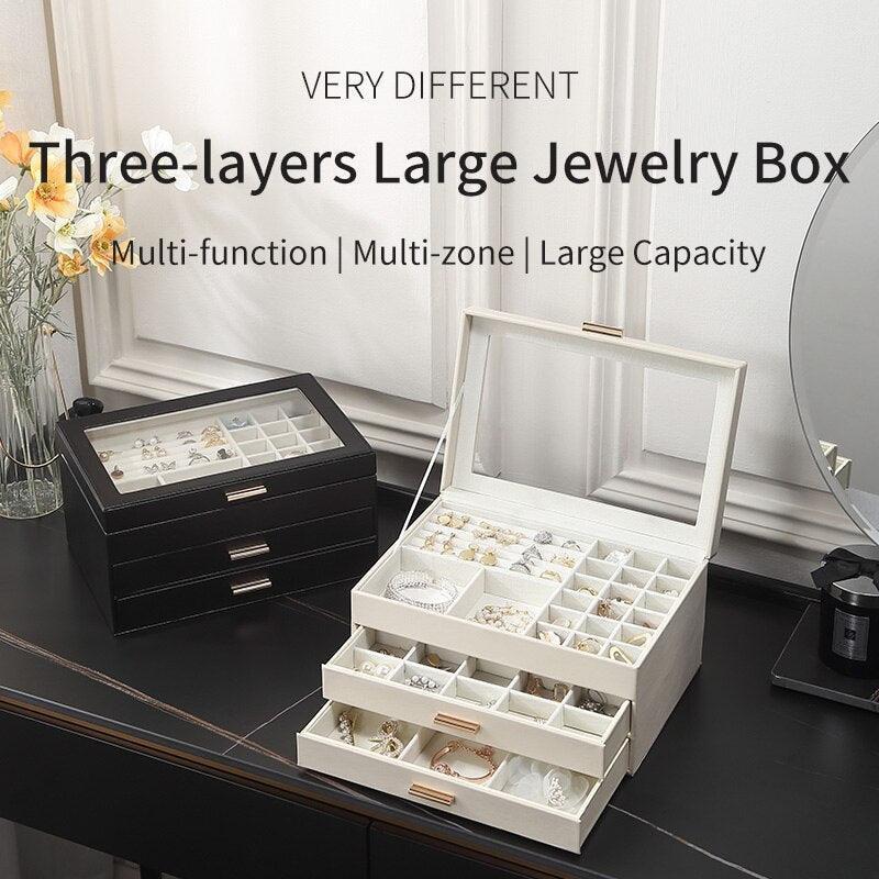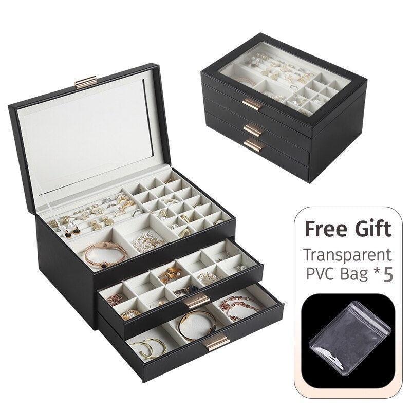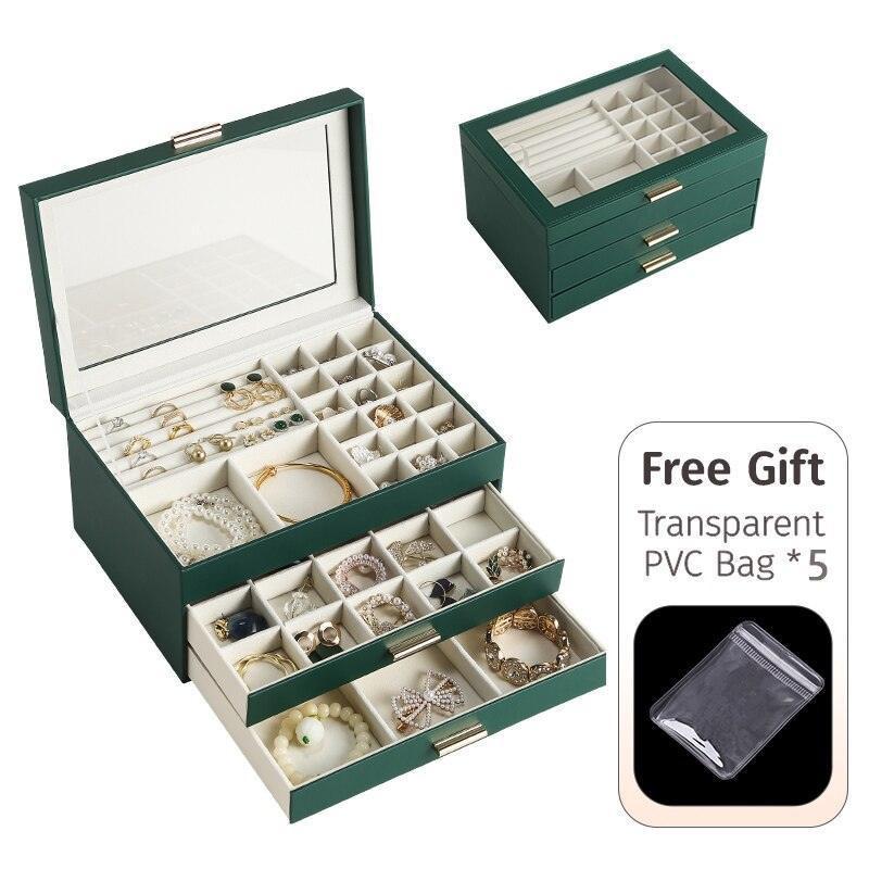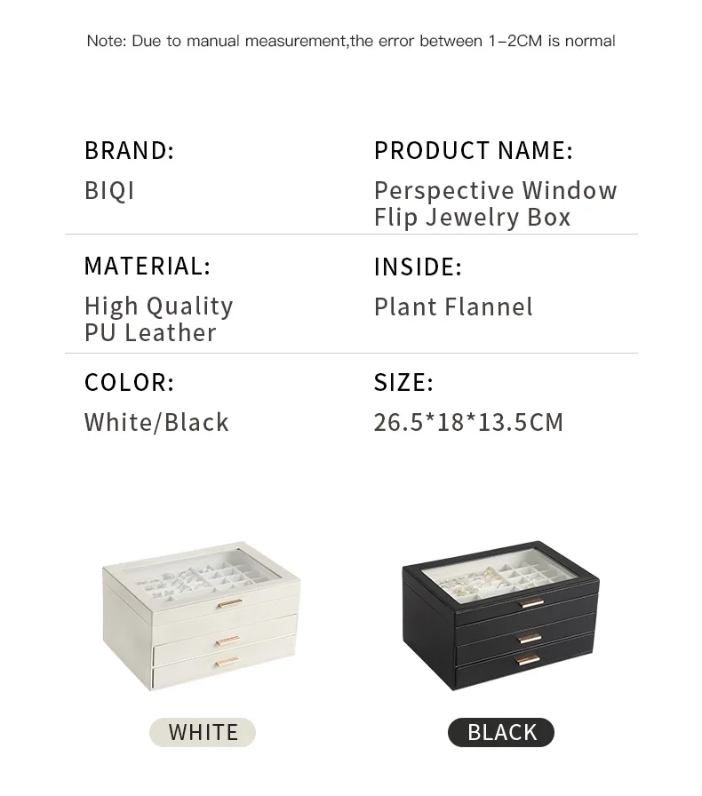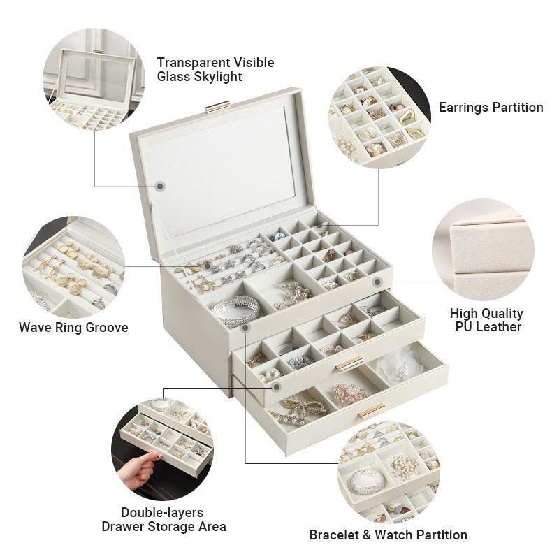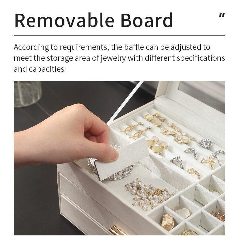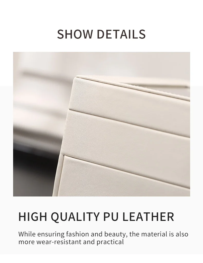 - 3중 보석 정리함: 다양한 레이아웃과 용량으로 반지, 귀걸이, 목걸이, 귀중품 등 다양한 크기의 보석을 보관할 수 있습니다.