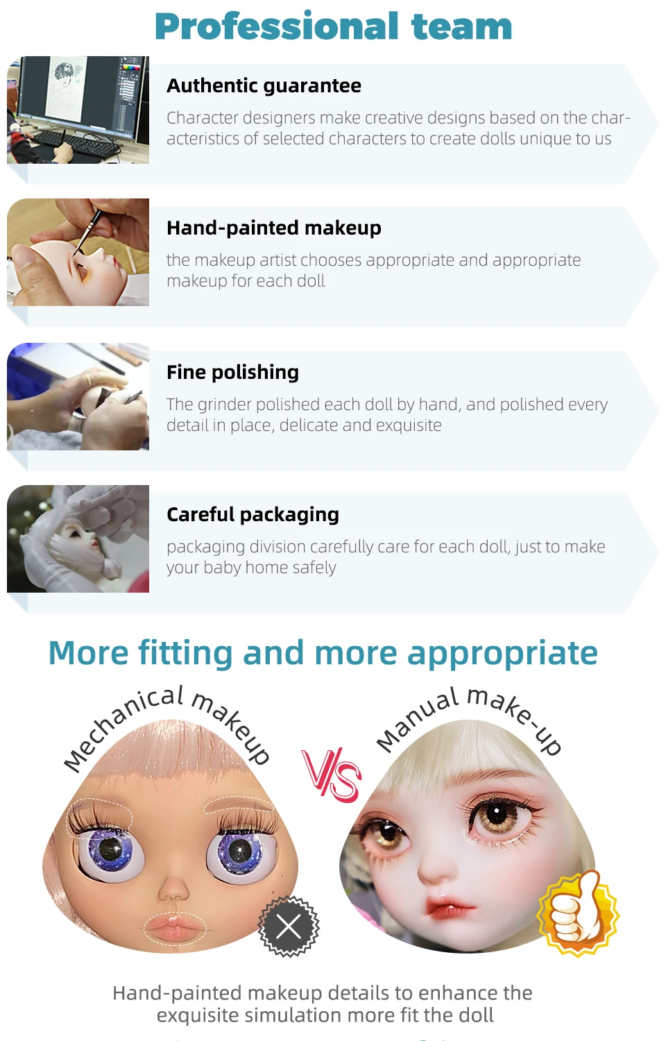 1. 강점 팀: R&D, 디자인, 생산 및 판매를 통합하여 10년 이상 BJD 인형에 중점을 둡니다. 창작, 디자인, 몰딩, 몰딩, 그라인딩, 메이크업, 의류 디자인 및 제작에 이르기까지 봉제, 모델링 등 최대 수백 가지 작업 절차의 원조 화가, 모델러, 드레서, 메이크업 아티스트를 소유 모두 숙련된 장인이 완성하여 BJD 인형에게 선사합니다. 각각의 스타일은 독특하고 예술의 미학적 가치가 높습니다.