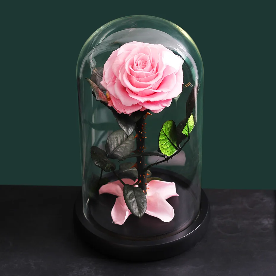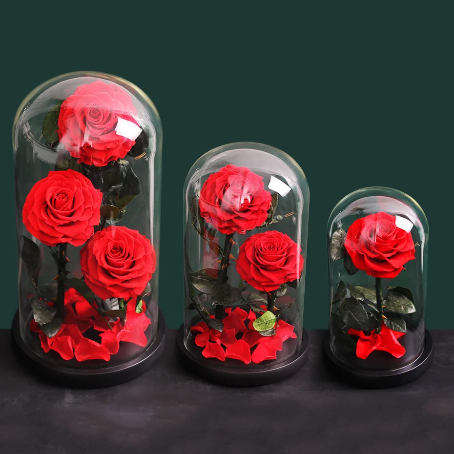 크리스마스 선물 유리 돔이있는 영원한 보존 된 장미 아름다움과 야수 진짜 꽃 영원히 사랑 결혼식 호의 파티 선물