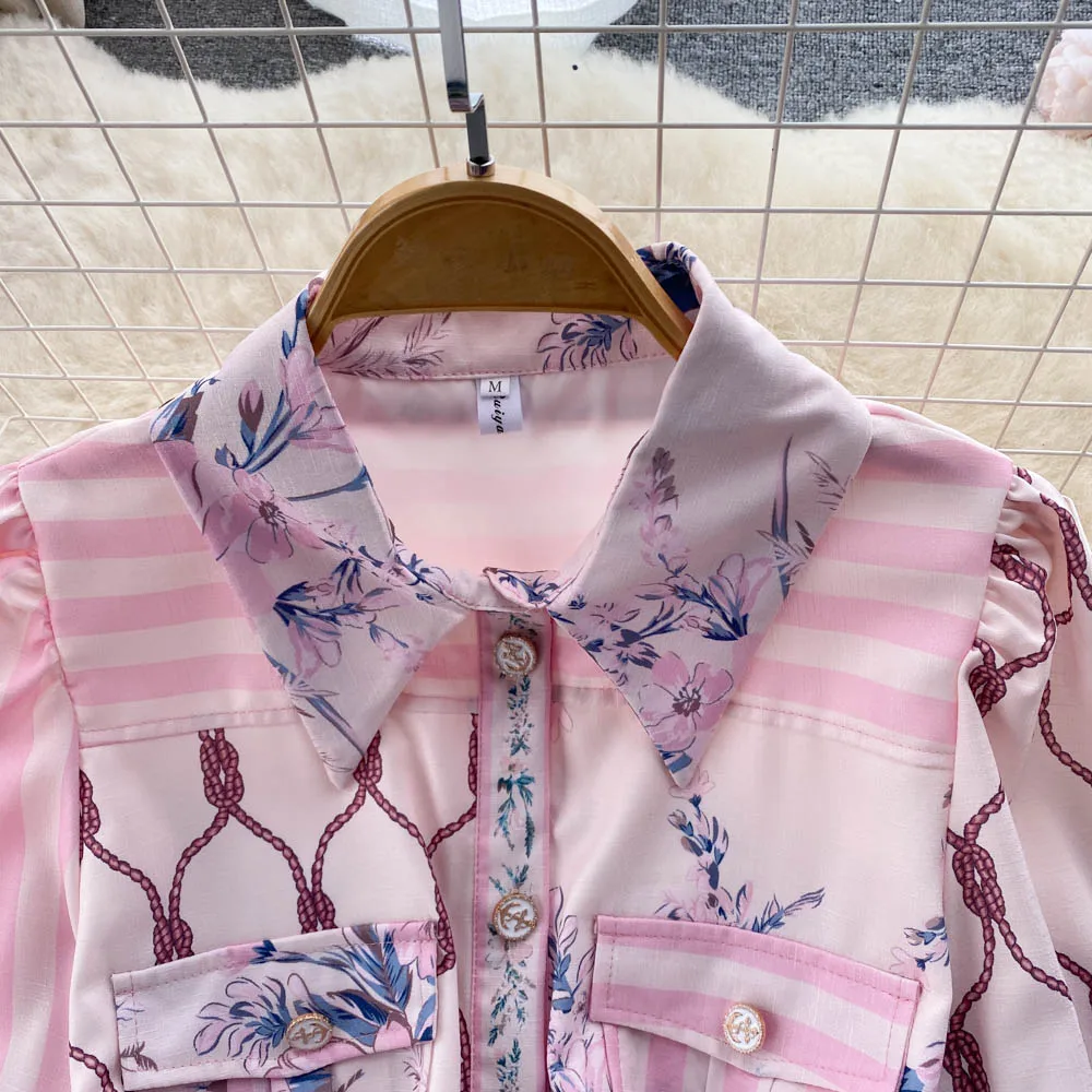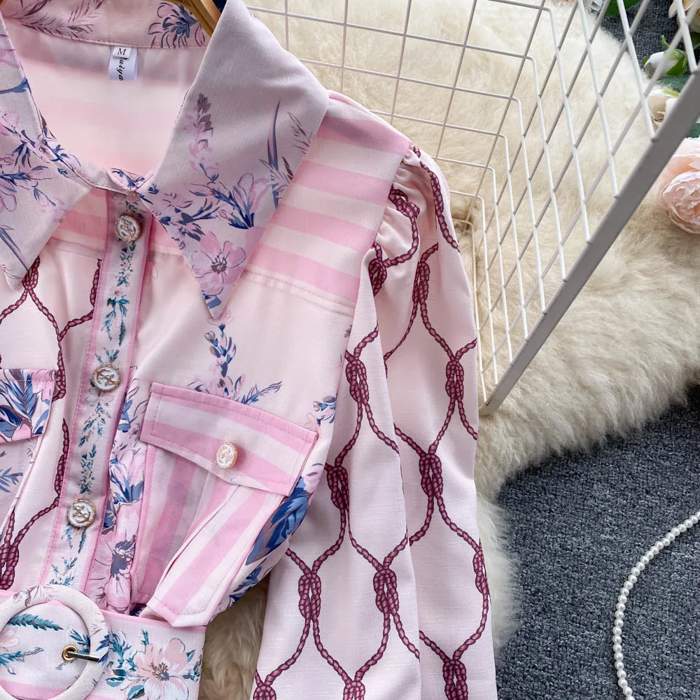 오피스 레이디에서 영감을 받은 이 복장은 턴다운 칼라와 돋보이는 A라인 컷으로 보완된 랜턴 슬리브의 매혹적인 실루엣을 자랑합니다. 몸매를 더욱 돋보이게 해주는 드레스로, 세련된 프린트 디자인에 시크한 벨트를 더해 화려함을 더했습니다.