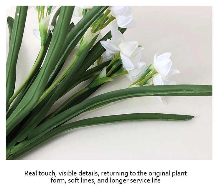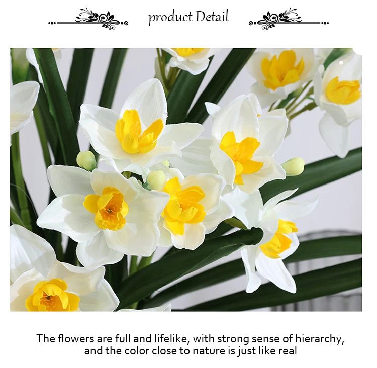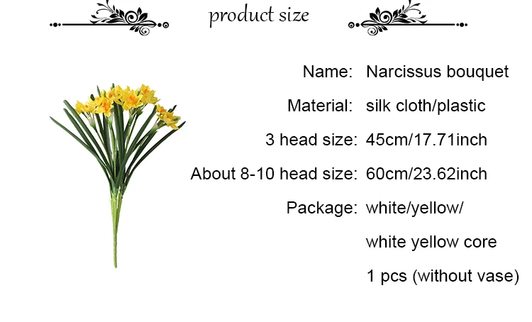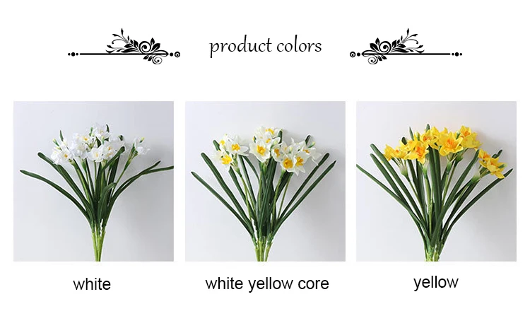 우리의 새로운 인공 실크 수선화 꽃다발을 소개합니다. 결혼식 꽃꽂이, 가정 장식 또는 멋진 사진 소품으로 완벽하게 추가됩니다. 고급 실크 천과 플라스틱 소재로 제작된 이 부케는 시들거나 유지 관리할 걱정 없이 수선화의 아름다움을 당신의 공간에 가져다줍니다. 각 패키지에는 45cm/17.71인치 크기의 헤드 3개와 60cm/23.62인치 크기의 헤드 약 8-10개 등 세 가지 헤드 크기로 제공되는 정교한 꽃다발(꽃병은 포함되지 않음)이 포함되어 있습니다. 흰색, 노란색 또는 노란색 코어가 있는 흰색의 세 가지 멋진 색상 옵션 중에서 선택하십시오.