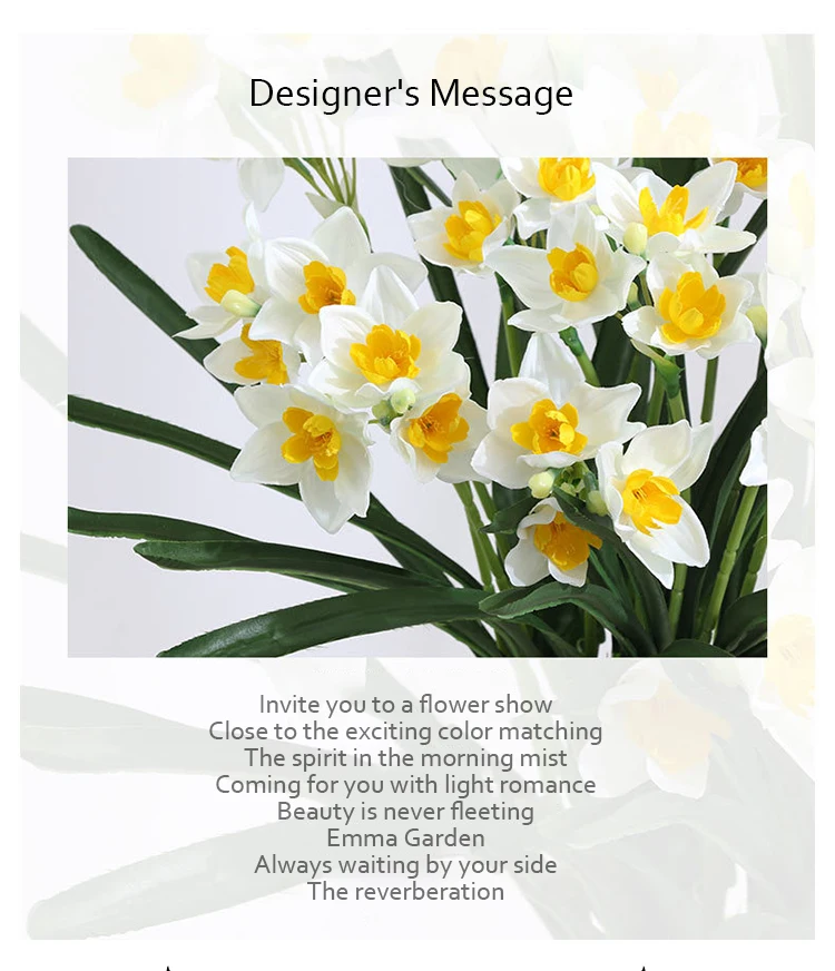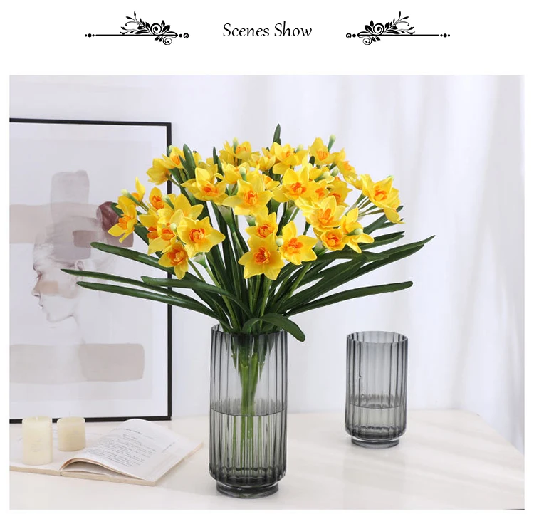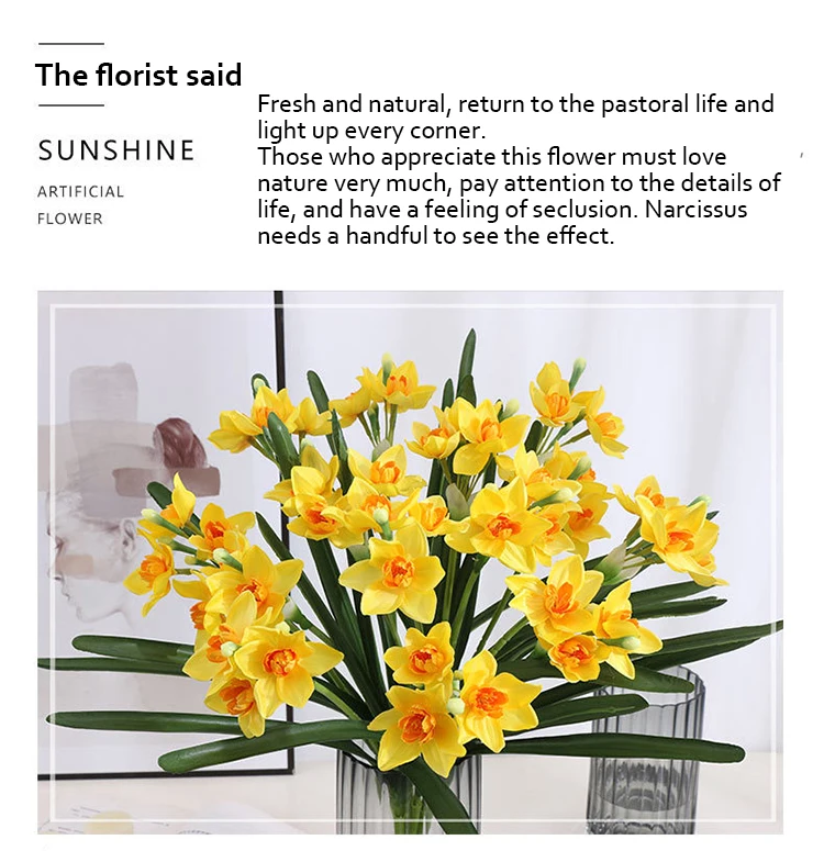 이 머스트 해브 아이템을 놓치지 마세요! 우리의 인공 실크 수선화 꽃다발은 어떤 경우에도 아름다움과 우아함을 더하기 위한 완벽한 선택입니다. 결혼식을 계획하든, 집을 장식하든, 멋진 사진을 찍든, 이 부케는 필수 액세서리입니다. 생생한 디테일과 생생한 색상으로 일년 내내 당신의 공간에 수선화의 기쁨과 따뜻함을 선사합니다. 시든 꽃에게 작별 인사를 하고 인공 실크 수선화 꽃다발로 영원한 아름다움을 만나보세요!