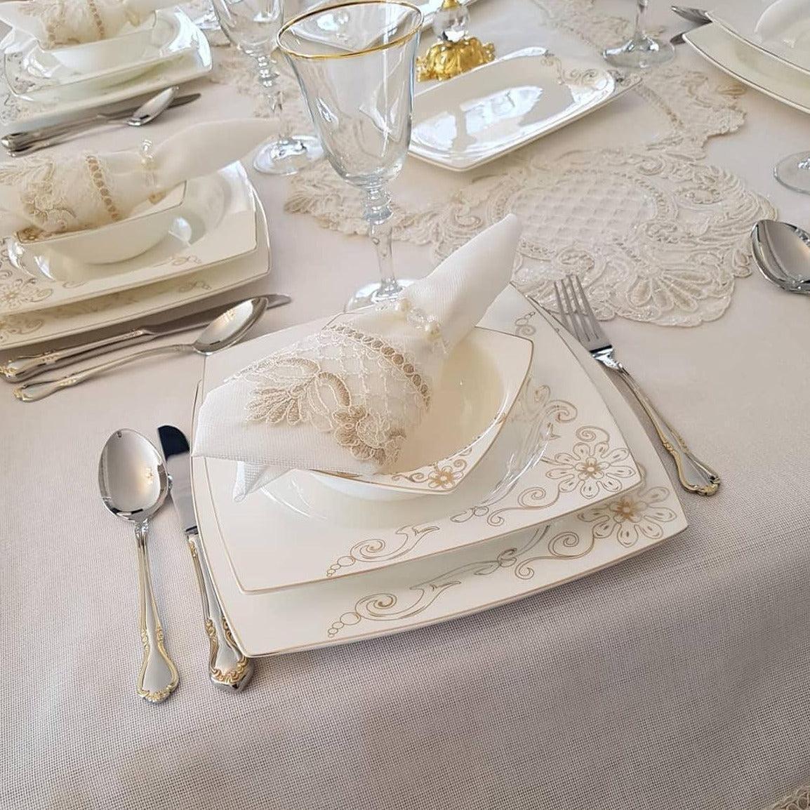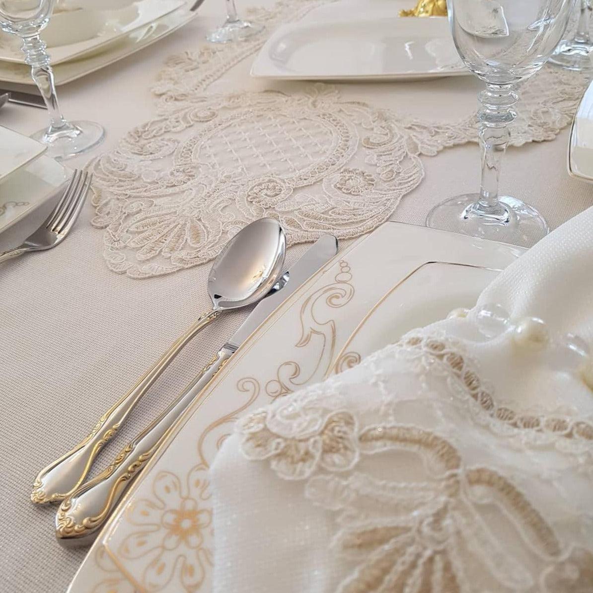이 럭셔리 프렌치 레이스 식탁보 세트는 테이블 장식을 향상시키려는 사람에게 꼭 필요한 아이템입니다. 은은한 린넨 원단에 프렌치 레이스를 바느질하여 제작한 정교한 자수 디자인은 어떤 행사에도 품격을 더해줍니다. 결혼식과 파티에 적합한 이 세트에는 냅킨 12개, 냅킨 링 12개, 식탁보 1개, 러너 1개가 포함되어 있습니다. 아름다운 직조 기술과 터키의 원산지로 손님에게 깊은 인상을 남깁니다.