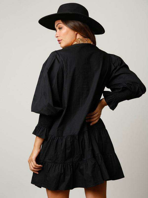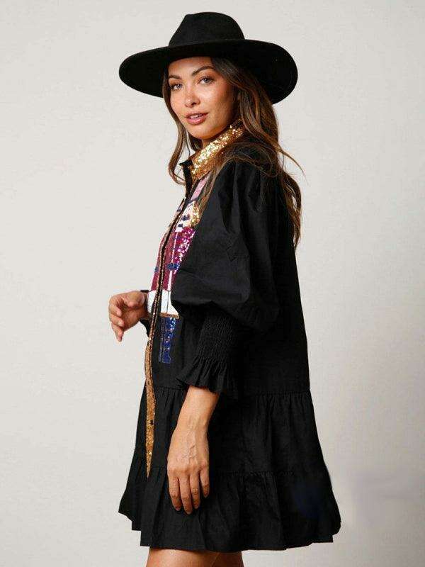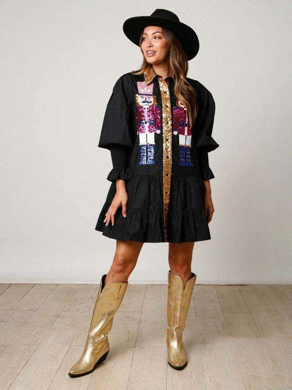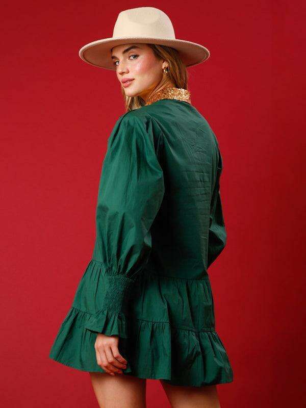 배색 긴소매 라펠 크리스마스 스팽글 드레스