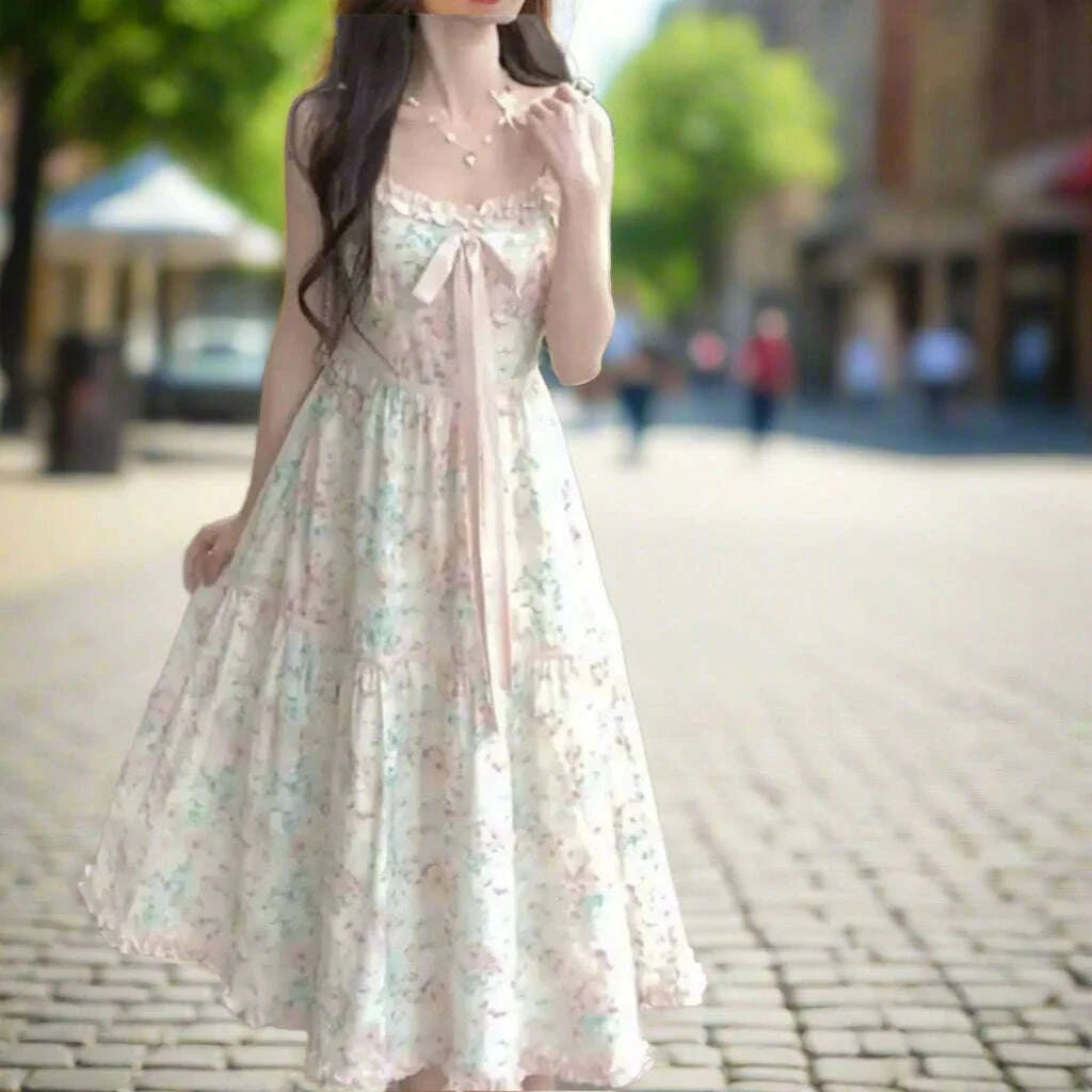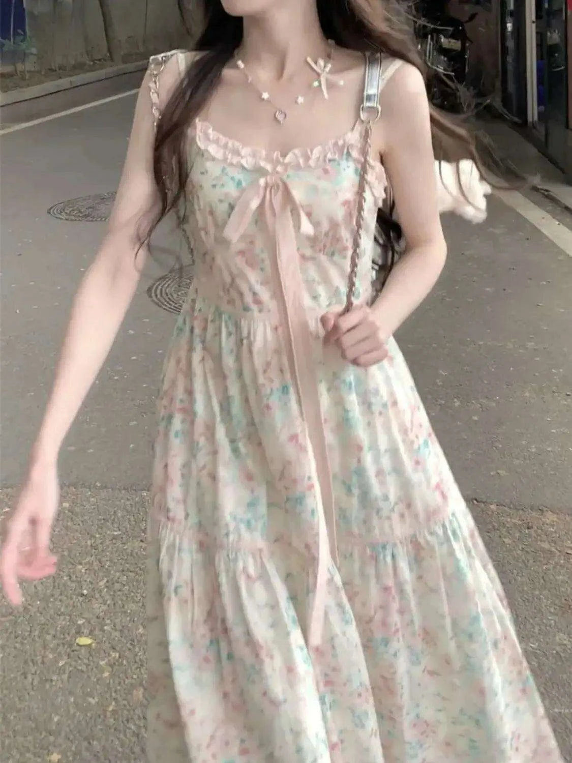 Y2K Floral Midi Dress with Sweet Bow - Chic Korean Style Casual Evening Party Wear for Women