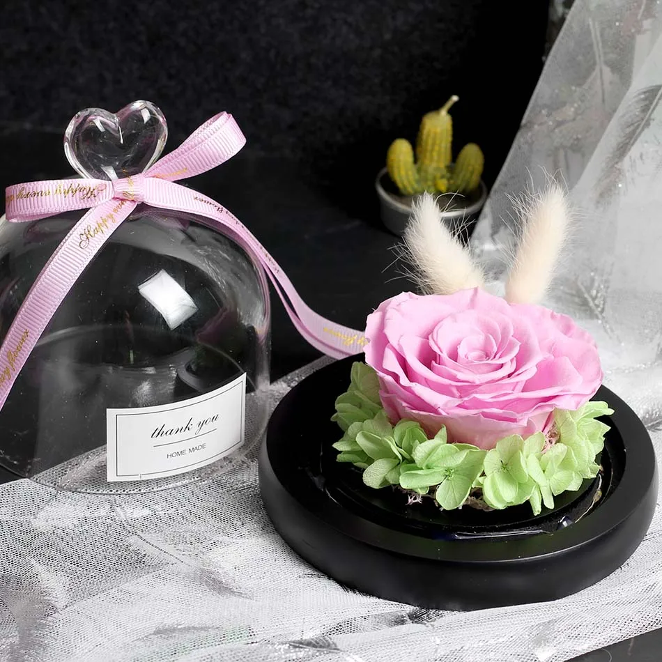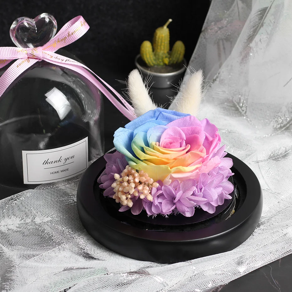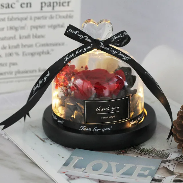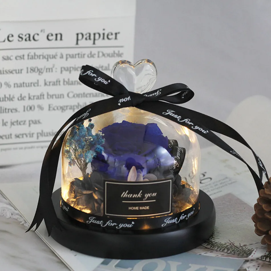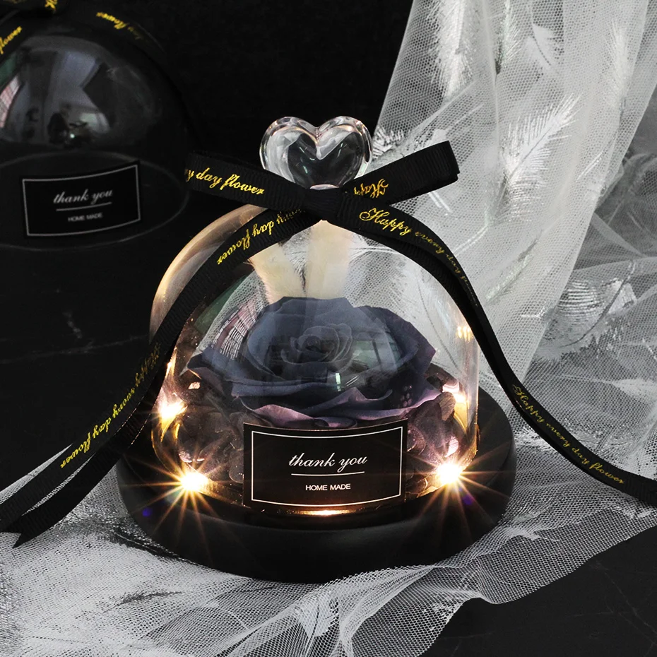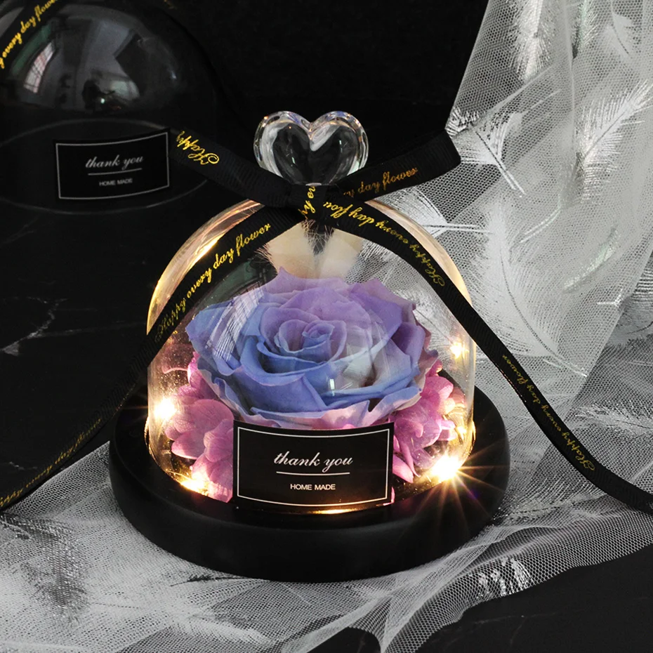 조명이 있는 독특한 유리 돔 장미 리얼 로즈와 뷰티 비스트 프리저브드 로즈 발렌타인 데이 선물