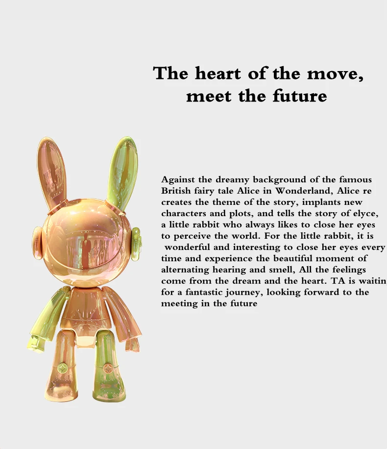 혁신의 핵심을 소개하며 홈 데코의 미래를 살펴보세요. 사랑받는 영국 동화 이상한 나라의 앨리스의 기발한 배경을 배경으로 우리의 패션 트렌드 인형 토끼는 이 시대를 초월한 이야기에 생명을 불어넣습니다. 새로운 캐릭터와 이야기가 가미된 이 작품은 눈을 감고 주변 세계를 탐험하는 것을 좋아하는 작은 토끼 엘리스의 이야기를 담고 있습니다. 그녀에게 있어서 침묵의 묵상 속에 보내는 매 순간은 마법 같은 경험이자, 소리와 향기의 감각적 여행, 꿈과 감정의 세계이다. Elyce는 꿈같은 풍경 속에서 미래의 만남을 기대하며 다음 모험을 간절히 기다리고 있습니다.