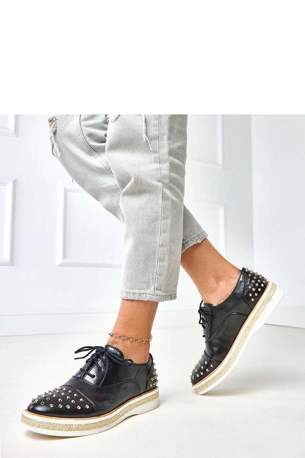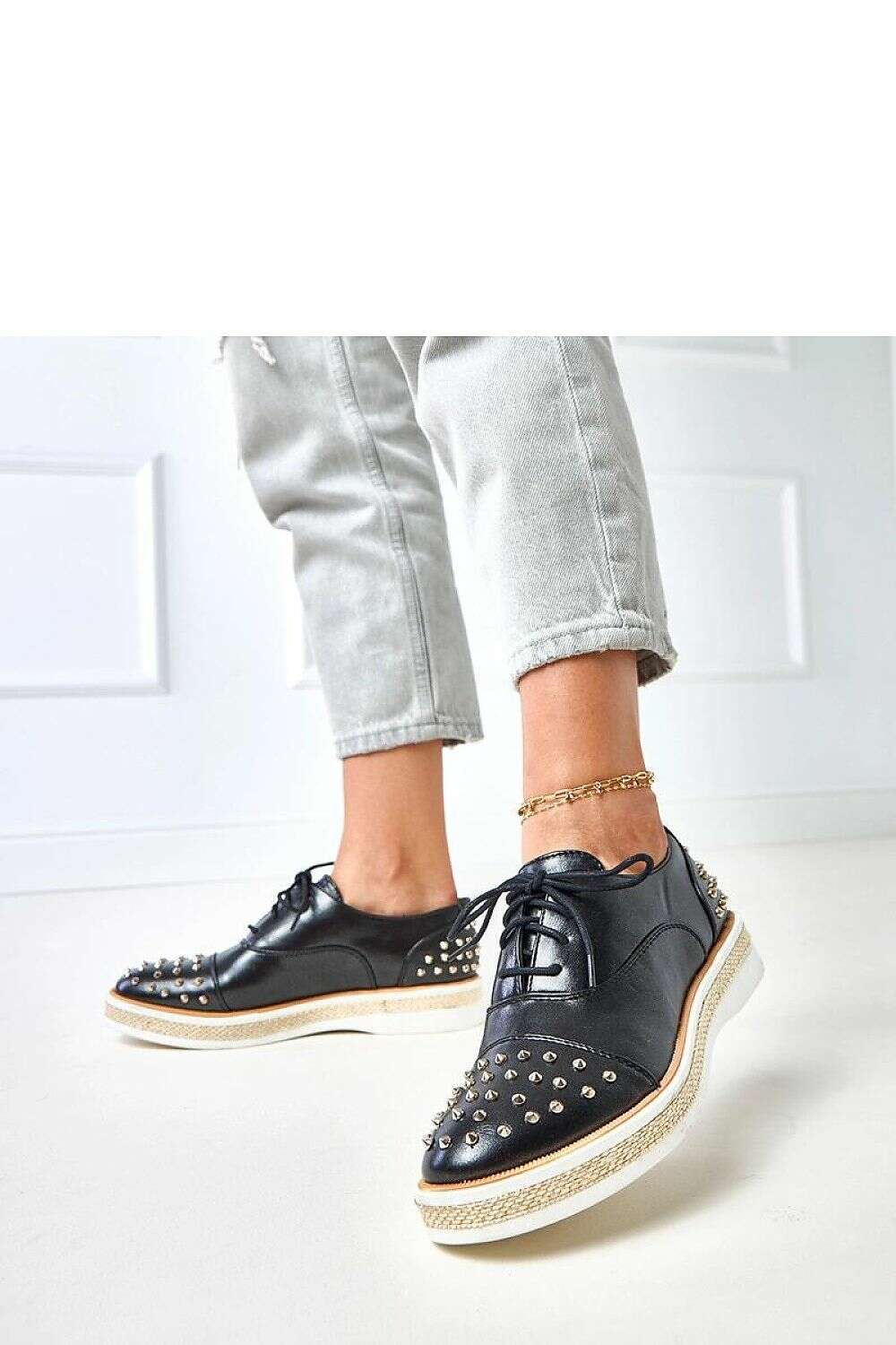 Unique moccasins for women who like classic with a hint of a rock style. Made of high quality eco-leather in a universal black color, they stand out with eye-catching studs placed on the front, which add character and a modern look to them. The model is set on a solid platform with a height of 3.5 cm, making the shoes comfortable and stable, while also visually slimming the silhouette. The lace-up closure allows for a perfect fit to the foot, and the round toe emphasizes the classic style. The eco-leather insole guarantees comfort all day long.