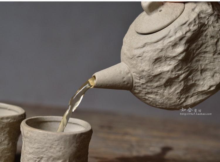 단단한 돌 모조 돌 찻주전자 찻잔 One Teapot 2개의 찻잔 바위 진흙 거친 도자기 손수 만든 세라믹 차 세트 차 주전자 세트