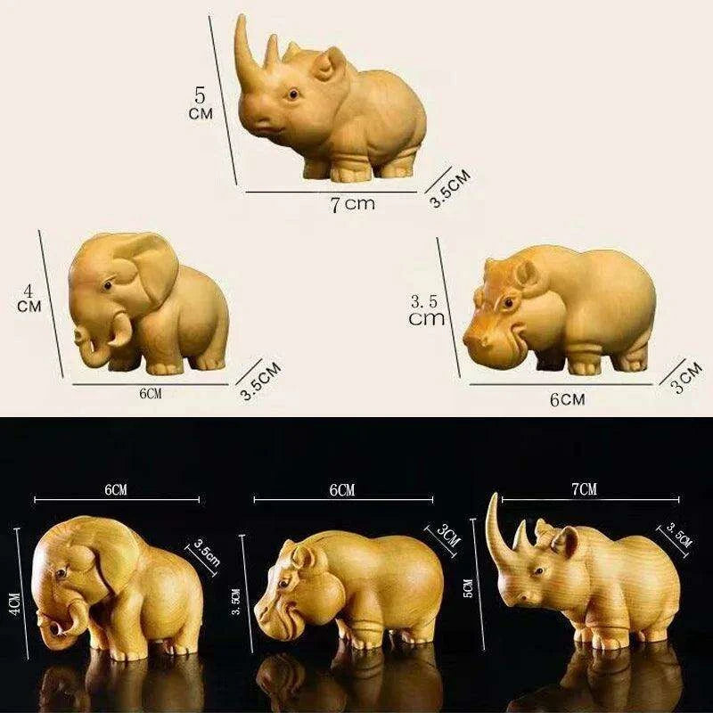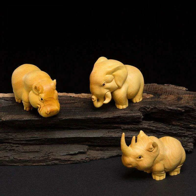 Handcrafted Wooden Wildlife Figurines: Distinctive Rhino, Hippo, and Elephant Decor for Home and Travel