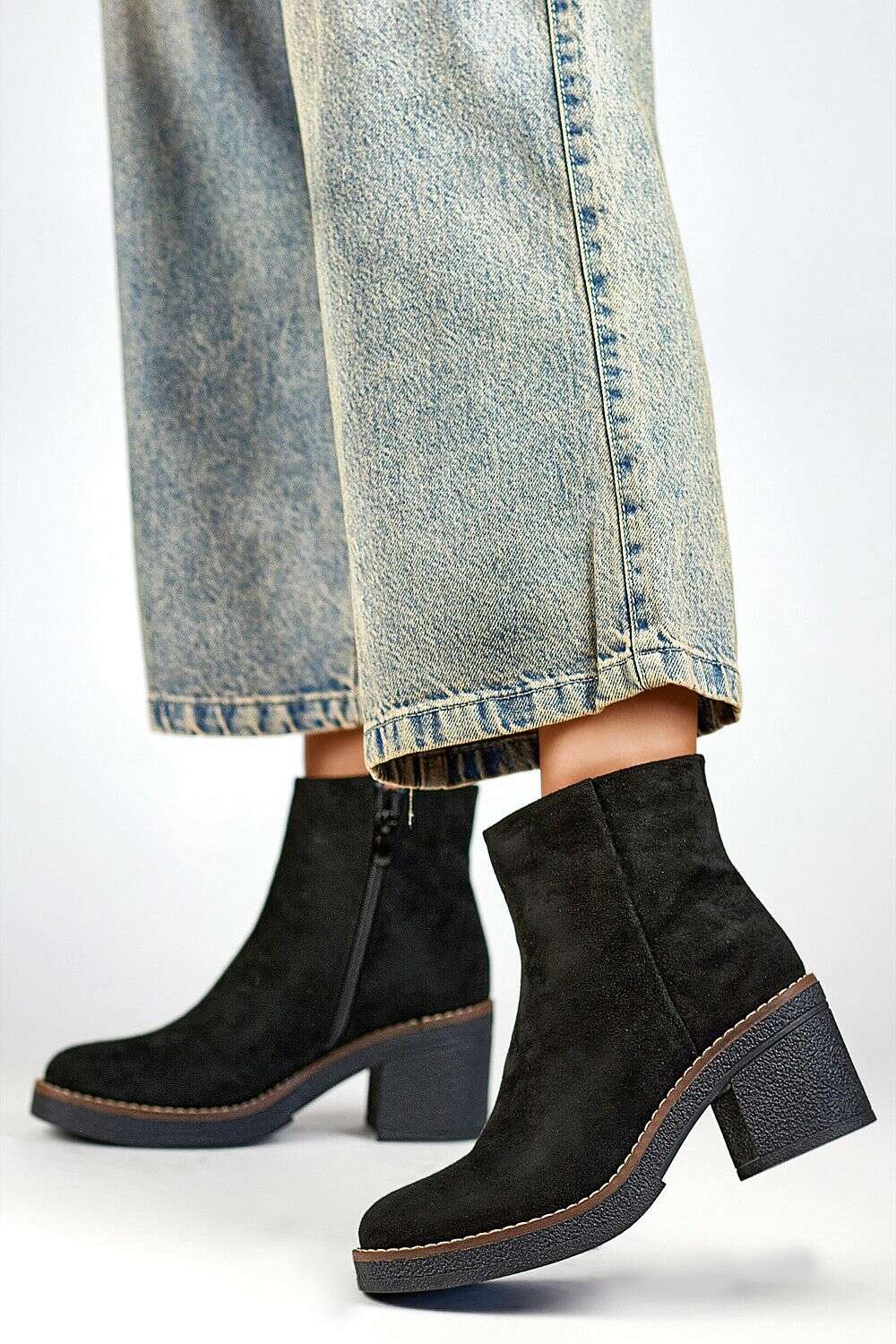 Elegant black boots made of eco-suede, which will be perfect for the autumn-winter season. The high upper (12 cm) adds to their stylish look, while the fur insulation and eco fur insole provide warmth and comfort. The 7 cm high stiletto heel provides stability and elegance, and the zipper closure makes them easy to put on and take off. The round toe gives them a classic, timeless feel that fits perfectly with winter styling.