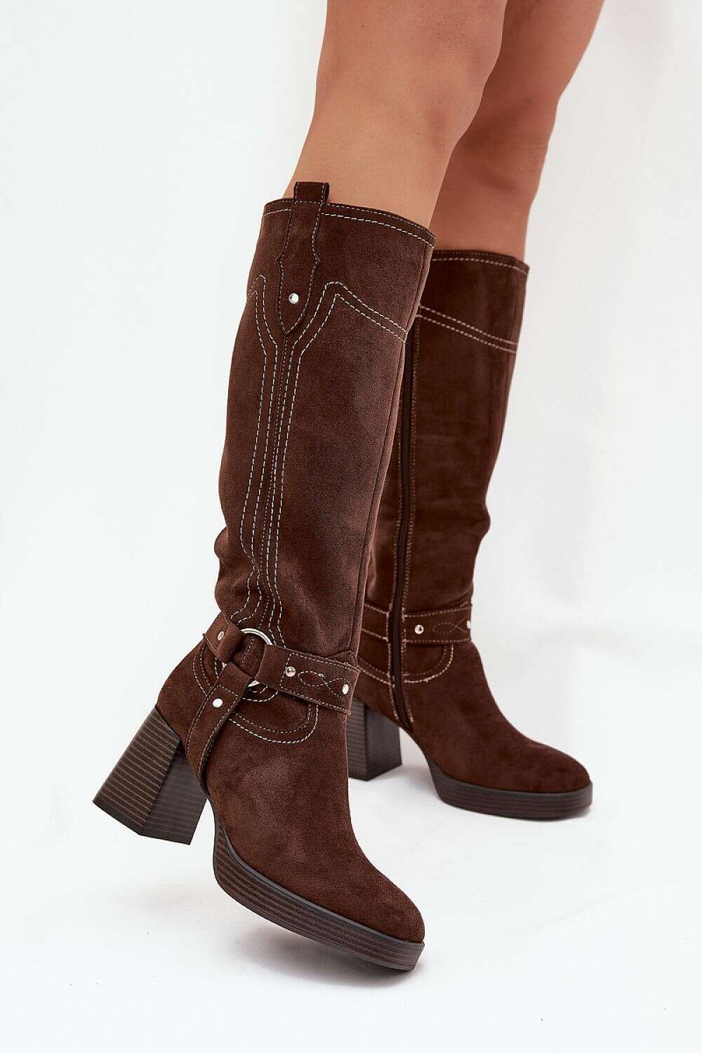 Women's boots made of eco suede. Set on a post heel. Fastened with a zipper, ensuring easy putting on, and insulation with a shoe blanket guarantees warmth on cooler days. The knee-high upper is decorated with a subtle element of straps and stitching, which add character to the boots. These boots will be a perfect choice for elegant and casual stylizations, providing comfort and a fashionable look.