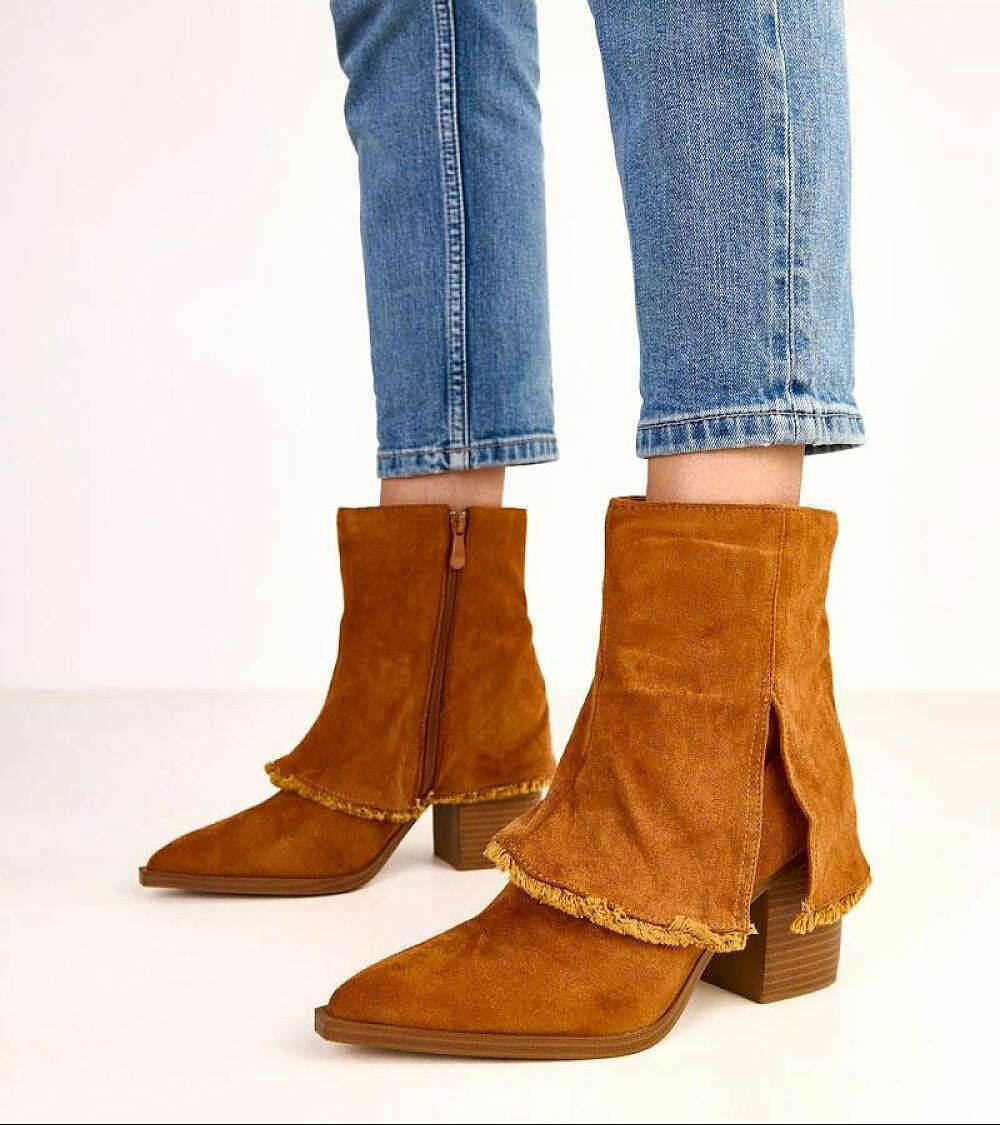 Stylish ankle boots with a folded shaft that combine elegance with a modern detail. Made of high-quality faux suede leather, they look impressive and are the perfect choice for cooler days. The model has a pointed toe that visually slims the foot, and a 9 cm heel provides stability and comfort while walking. The folded shaft adds character and a fashionable accent to the boots, while the zipper closure makes them easy to put on. Thanks to the lining and fabric insole, the boots guarantee warmth and comfort all day long. The 13 cm shaft beautifully envelops the ankle, creating a modern and elegant look.