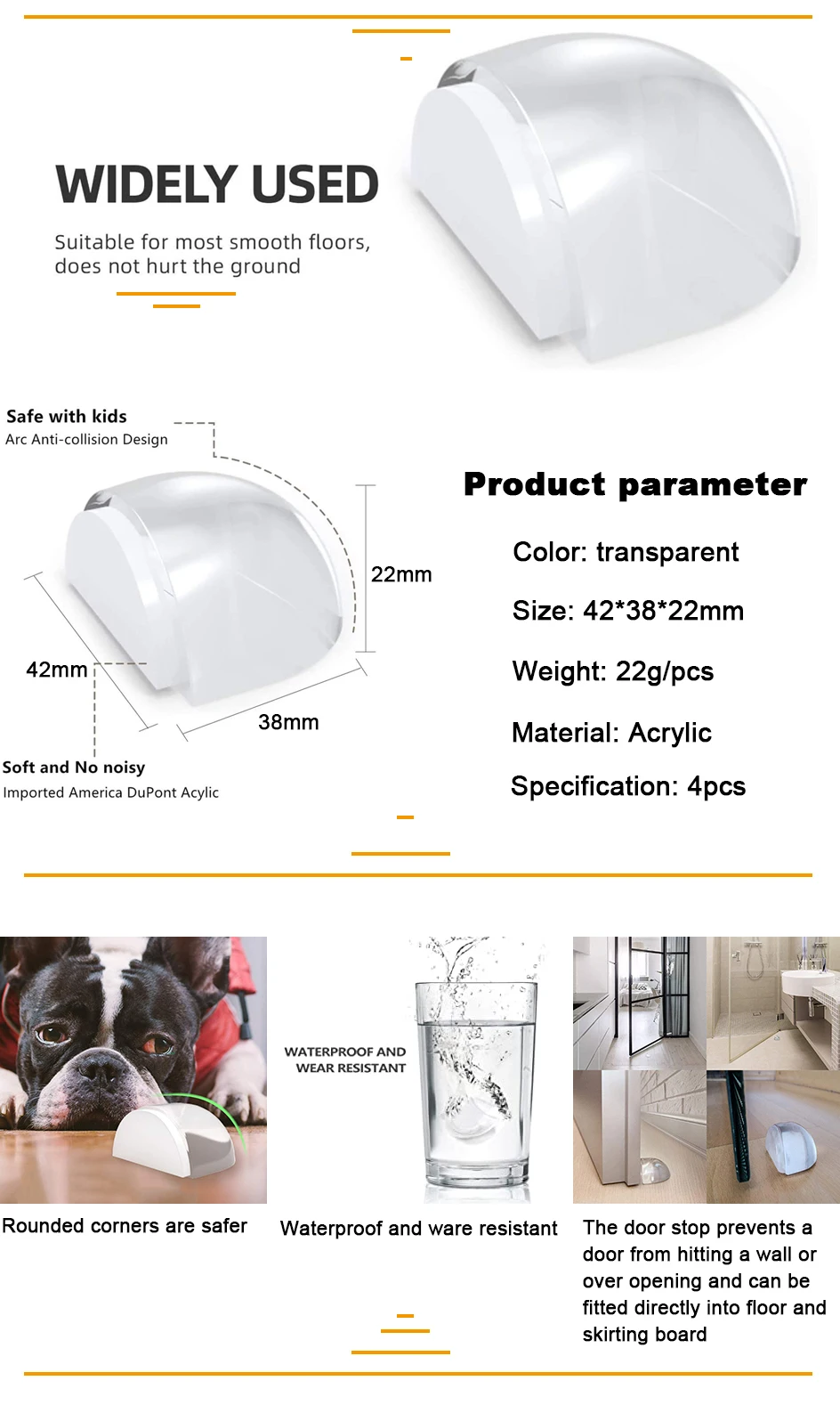 - 내구성이 뛰어나고 설치가 용이함: 드릴링이 필요하지 않습니다. 이 아크릴 도어 스톱은 최고 수준의 충격 보호 기능을 제공하며 필요한 경우 쉽게 제거할 수 있습니다.