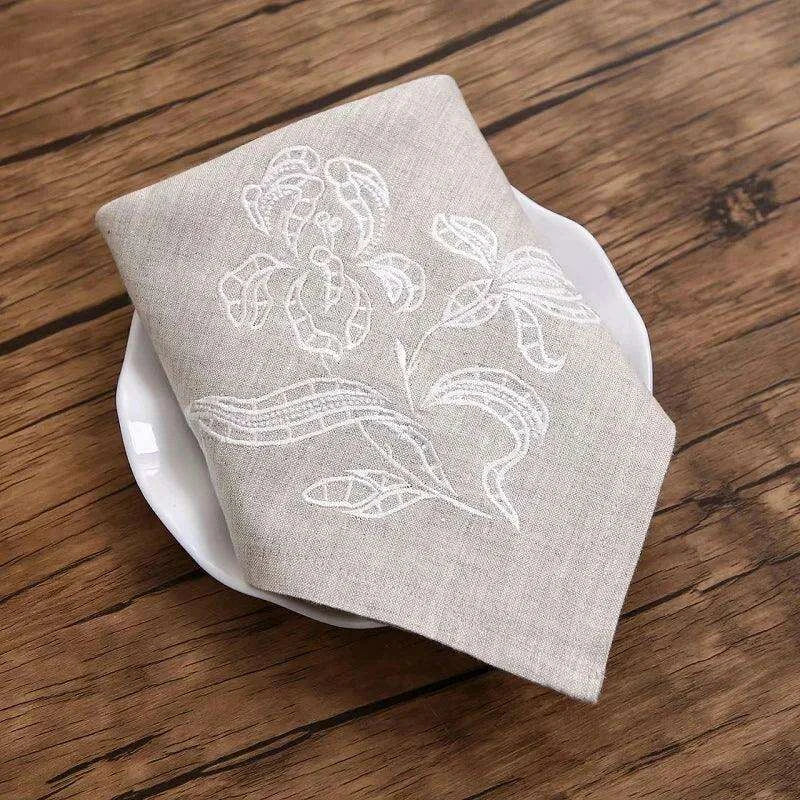 With the Iris Blossom Embroidered Linen Napkin Collection, you are not only choosing a practical dining accessory but also embracing an elegant lifestyle. Inspired by the beauty of the Camellia flower and the artistry of Jimo Lace embroidery, this collection embodies modern sophistication.