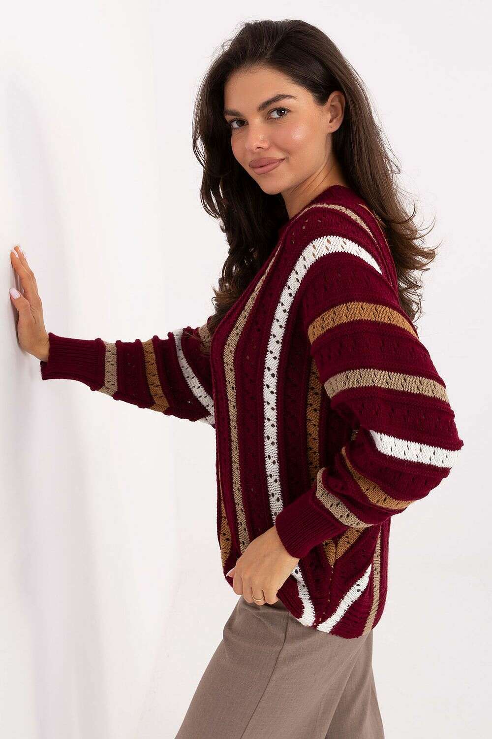 Oversized women's sweater with a casual character, perfect for everyday occasions. Made of acrylic, it provides warmth and comfort when worn. A model of standard length, with a classic round neckline and long sleeves. The lacy pattern and stripes give it lightness and original character, making it great to pair with jeans, leggings or a skirt. This is a fashionable and comfortable option for cooler days.