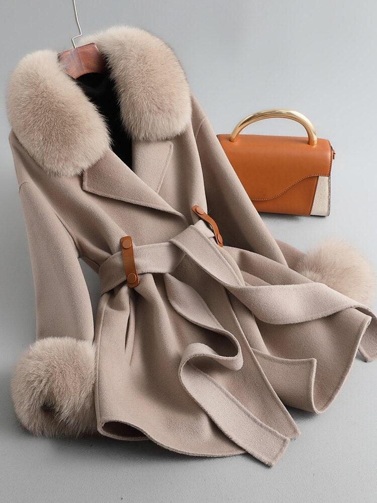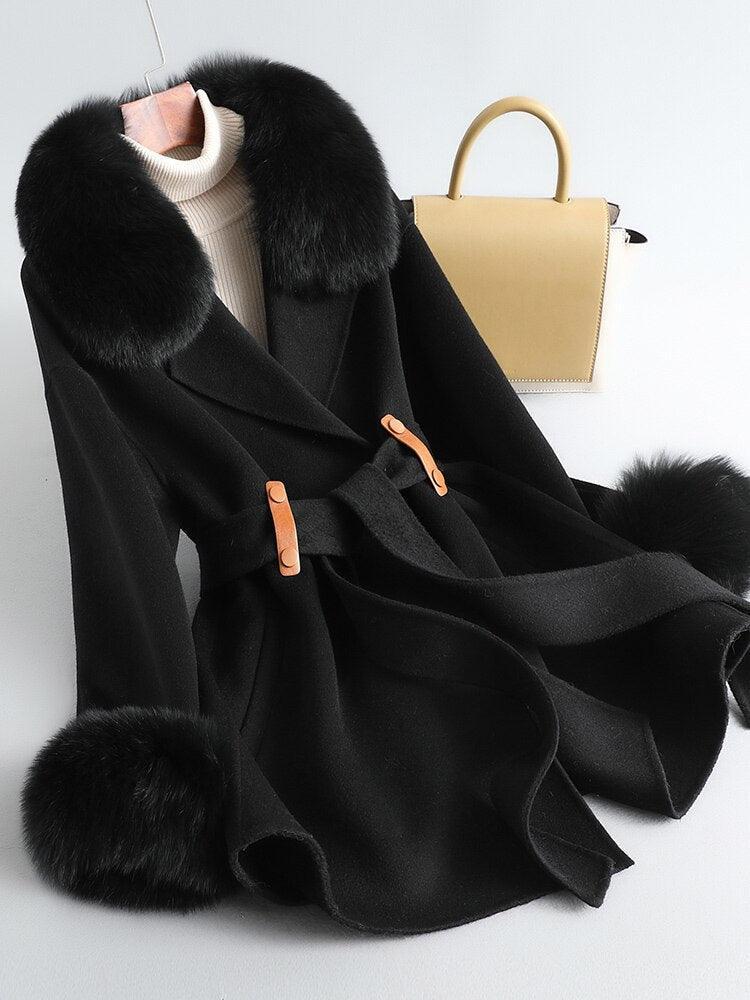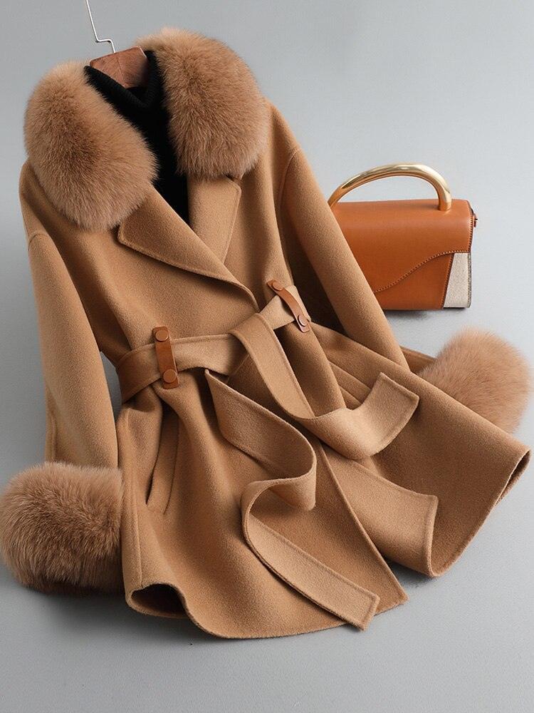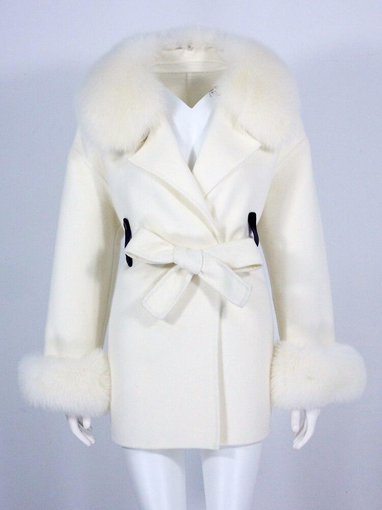 MENINA BONITA 2022 리얼 모피 코트 겨울 자켓 여성 천연 여우 모피 칼라 커프스 벨트 캐시미어 울 모직 겉옷 Streetwear