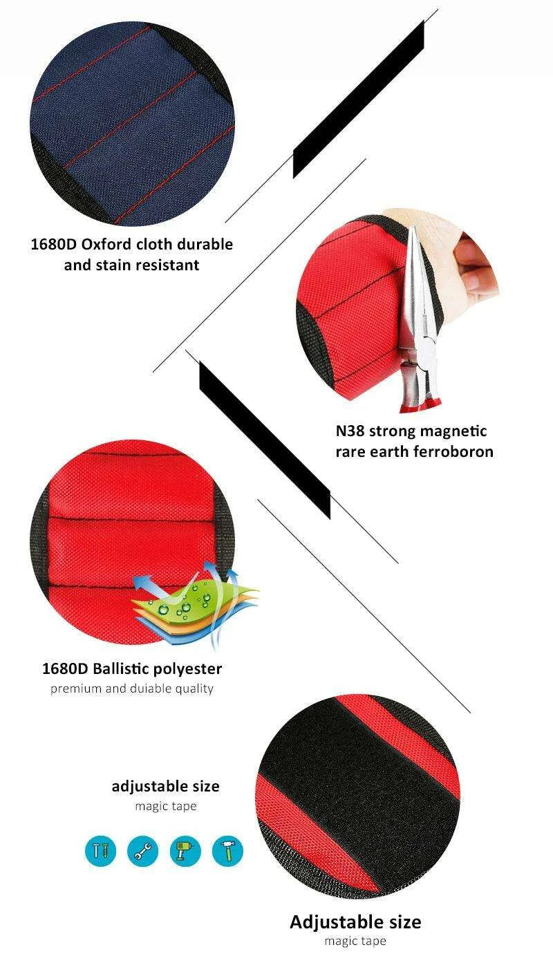 이 휴대용 자석 손목 밴드 및 도구 가방 콤보는 나사, 못 또는 드릴 비트를 정기적으로 다루는 모든 사람에게 절대적으로 필요합니다. 혁신적인 디자인으로 쉽게 접근하고 효율적으로 정리할 수 있어 DIY나 전문적인 작업 중에 시간과 노력을 절약할 수 있습니다. 1680D 옥스퍼드 천과 믿을 수 있는 전체 나일론 벨크로와 같은 내구성이 뛰어난 소재로 제작된 이 제품은 긴 수명을 약속하며 모든 전기 기술자와 주택 개조 애호가에게 없어서는 안 될 도구입니다.