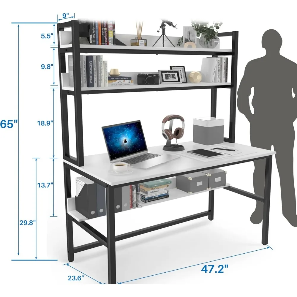 Modern White Office Desk with Hutch and 3-Tier Bookshelf for Stylish Workspace Efficiency