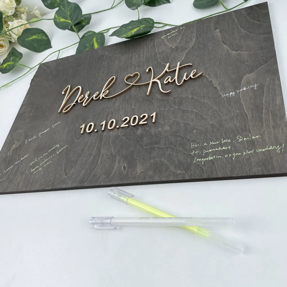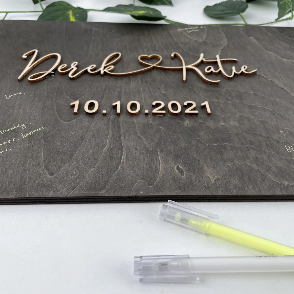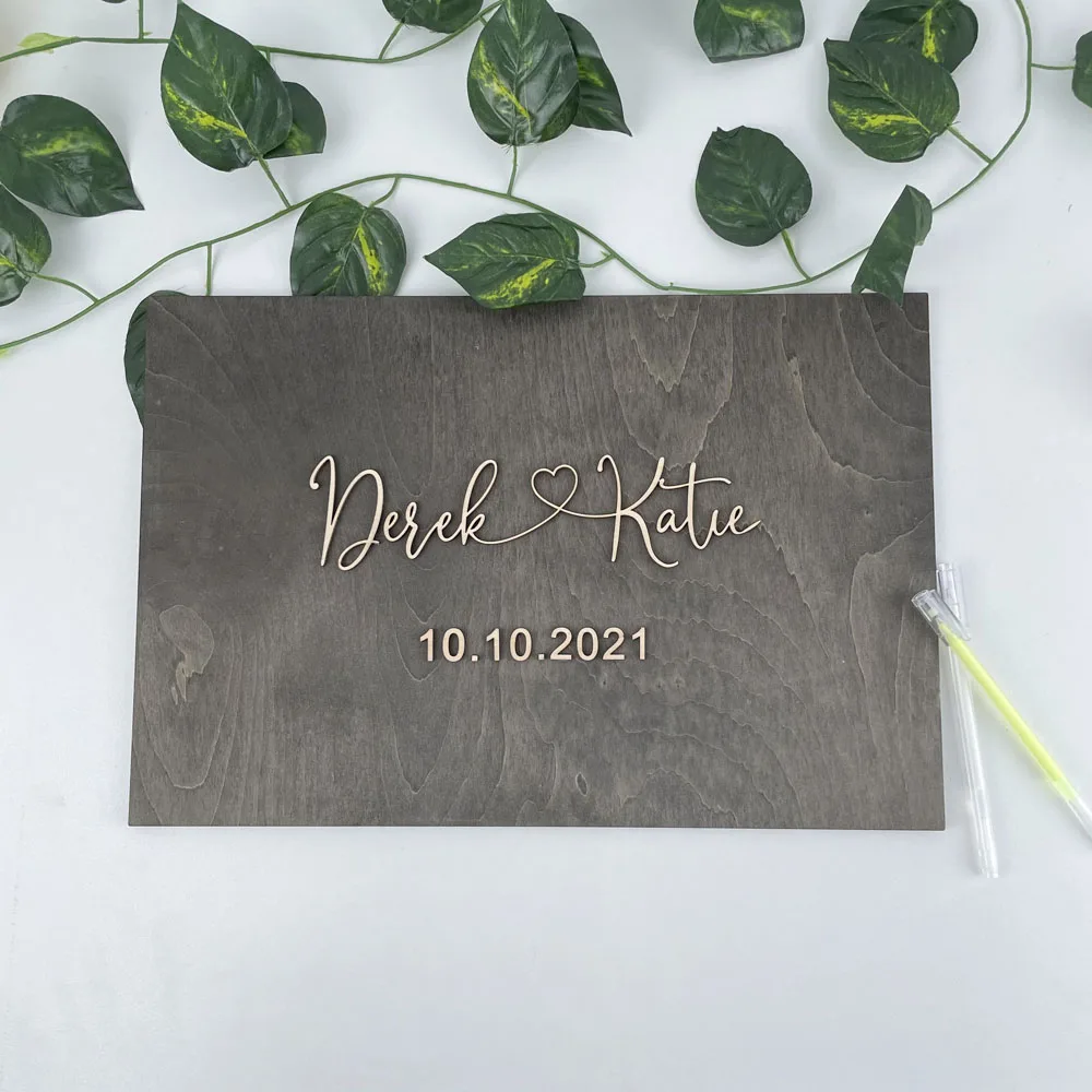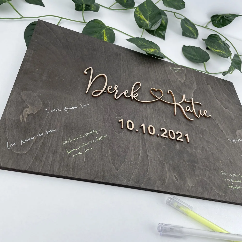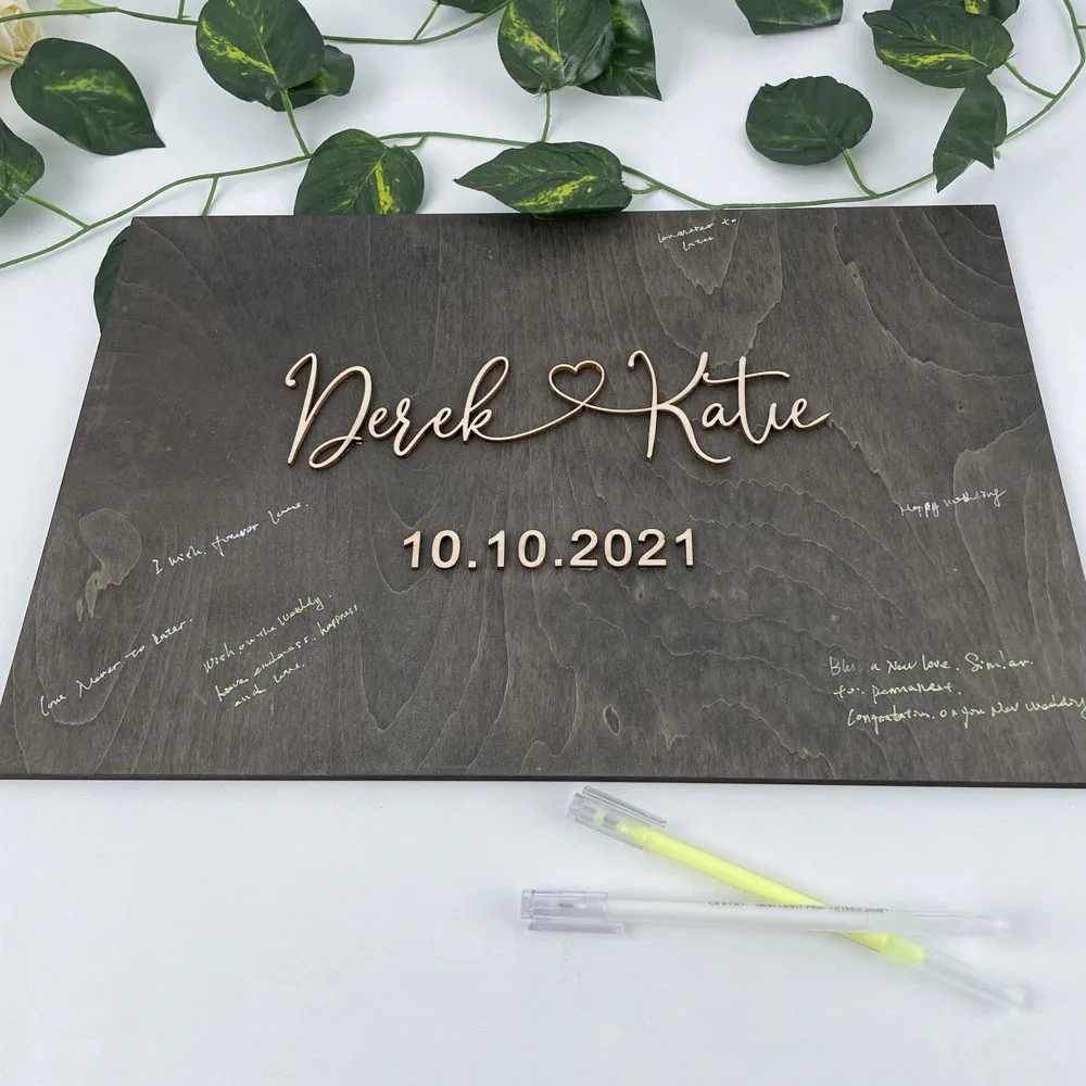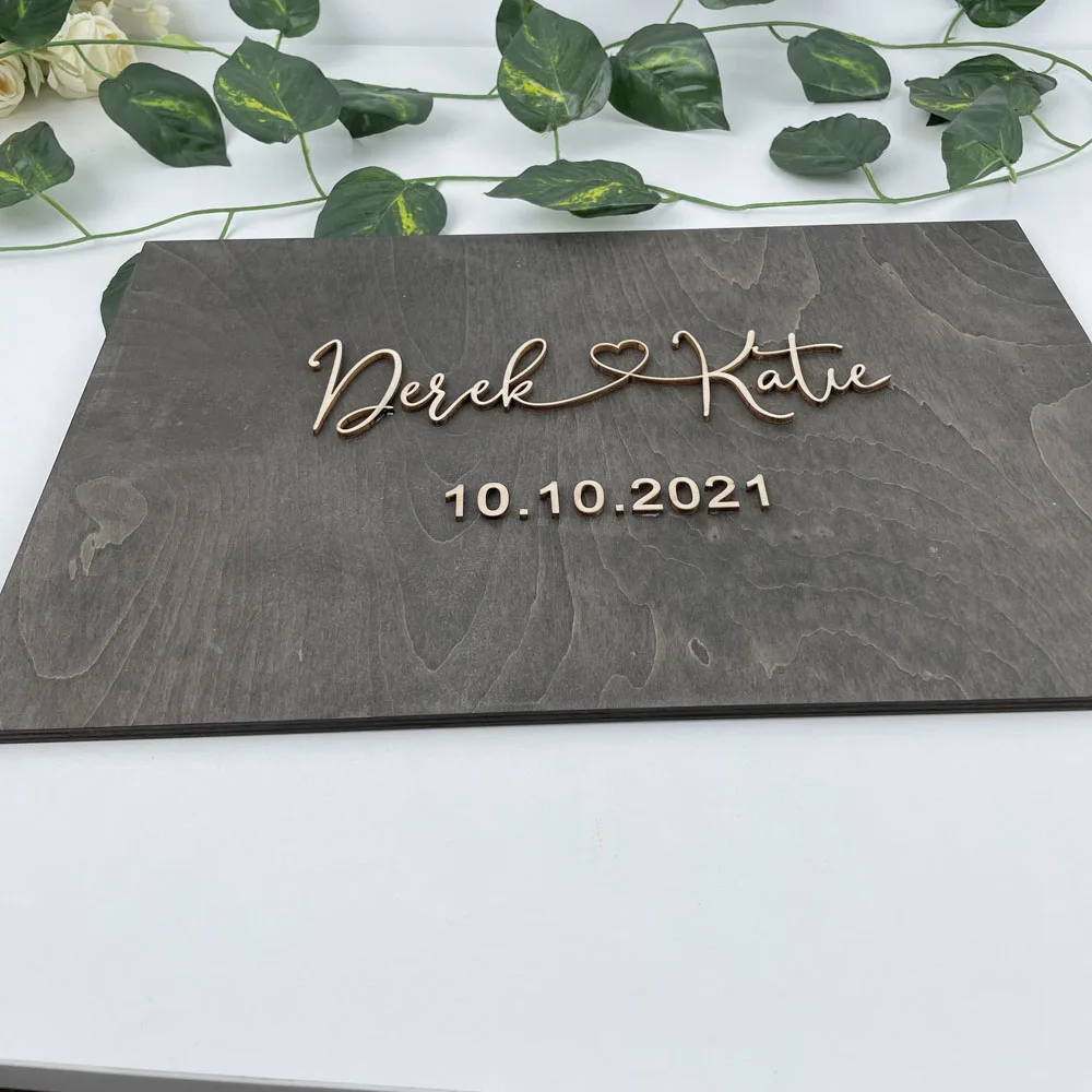 개인화 된 신부 신랑 이름 및 날짜 3D 우드 웨딩 방명록 하트 방명록 로그인 기념일 선물로 맞춤 고유 이름