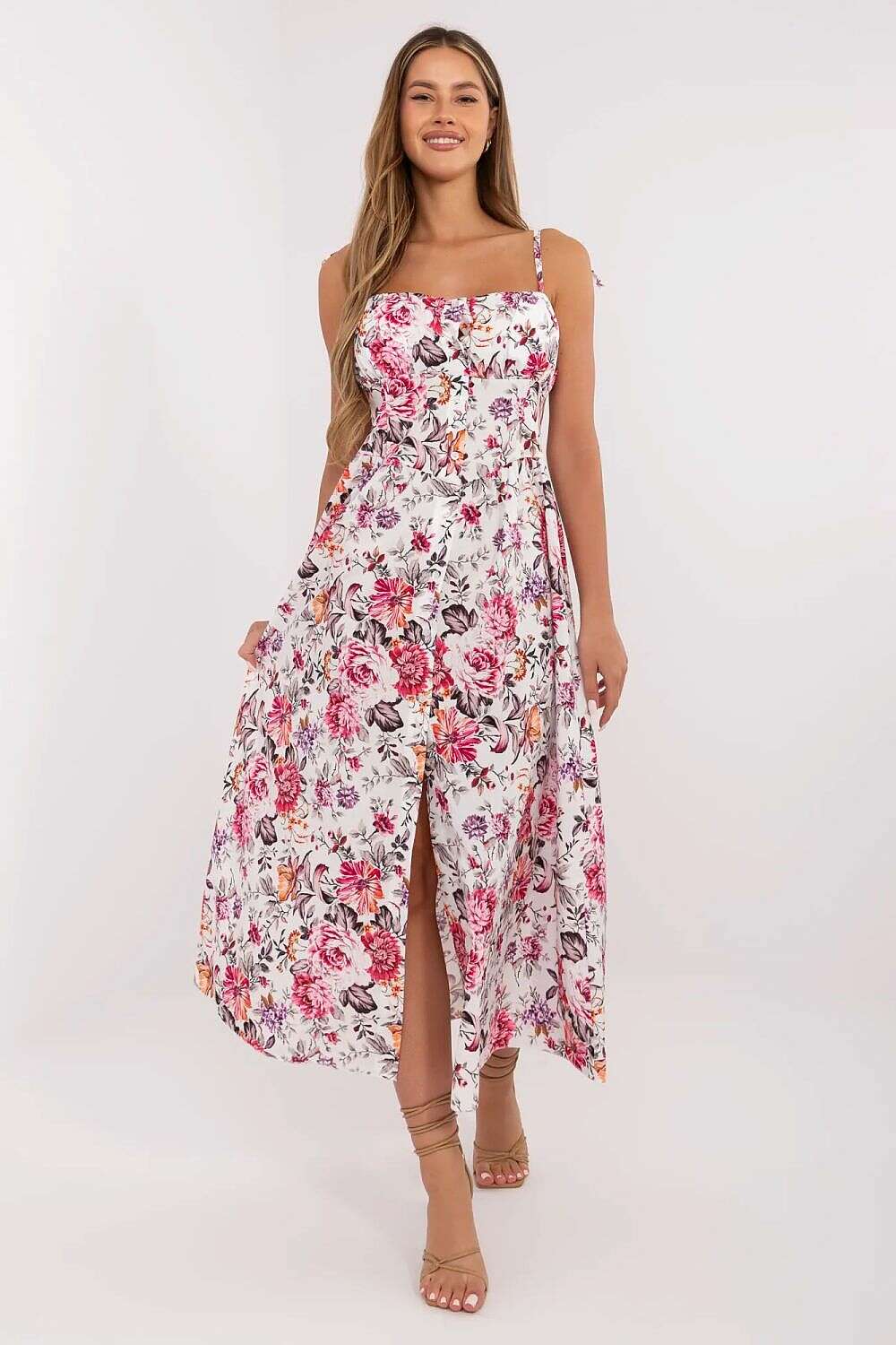 Daydress model 213225 is a stylish midi dress designed for everyday wear with a feminine, flared silhouette. The square neckline and tied straps offer a customizable fit and lasting comfort. A corset waist beautifully defines the silhouette, while sewn-in padded cups provide additional support.