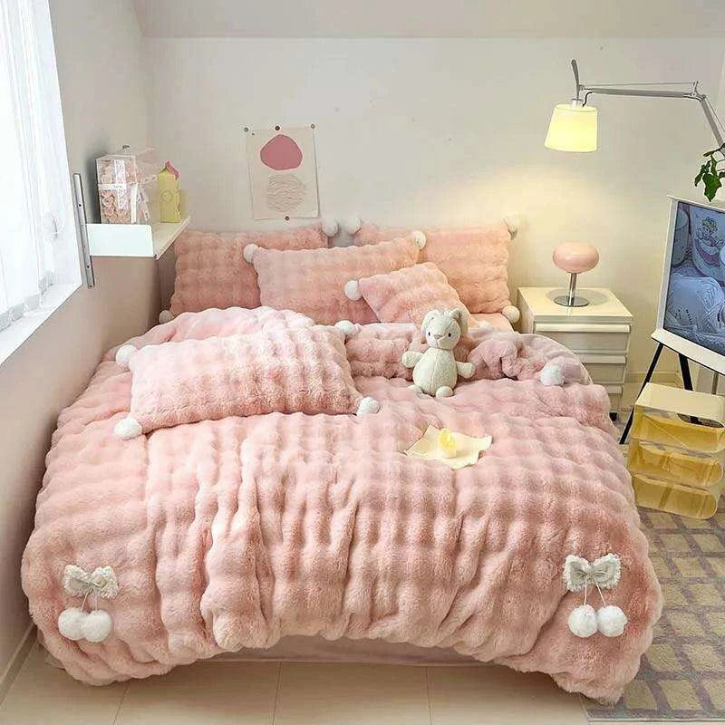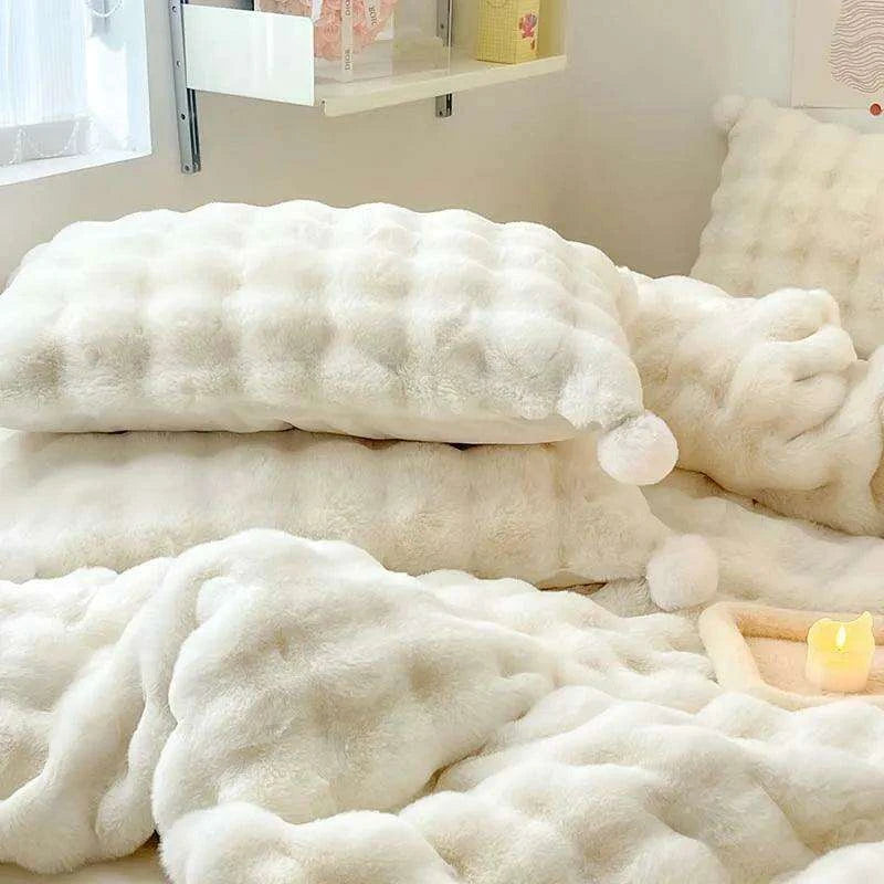 Indulge in the cozy embrace and unique charm of our Plush Faux Rabbit Fur Bedding Ensemble with Charming Ball Accents - Duvet Cover, Sheets, and Pillowcases. Elevate your sleep experience and add a touch of elegance to your bedroom sanctuary today!