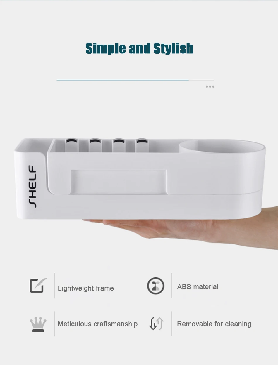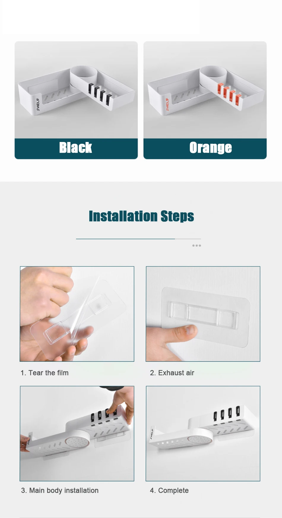 이 수납랙의 후크 디자인으로 수납력을 높일 수 있으며, 컴팩트한 사이즈(30 x 10 x 8 cm)로 어떤 공간에도 잘 어울립니다. 검은색 또는 주황색으로 제공되는 이 정리 선반은 모든 가정의 필수 아이템입니다.