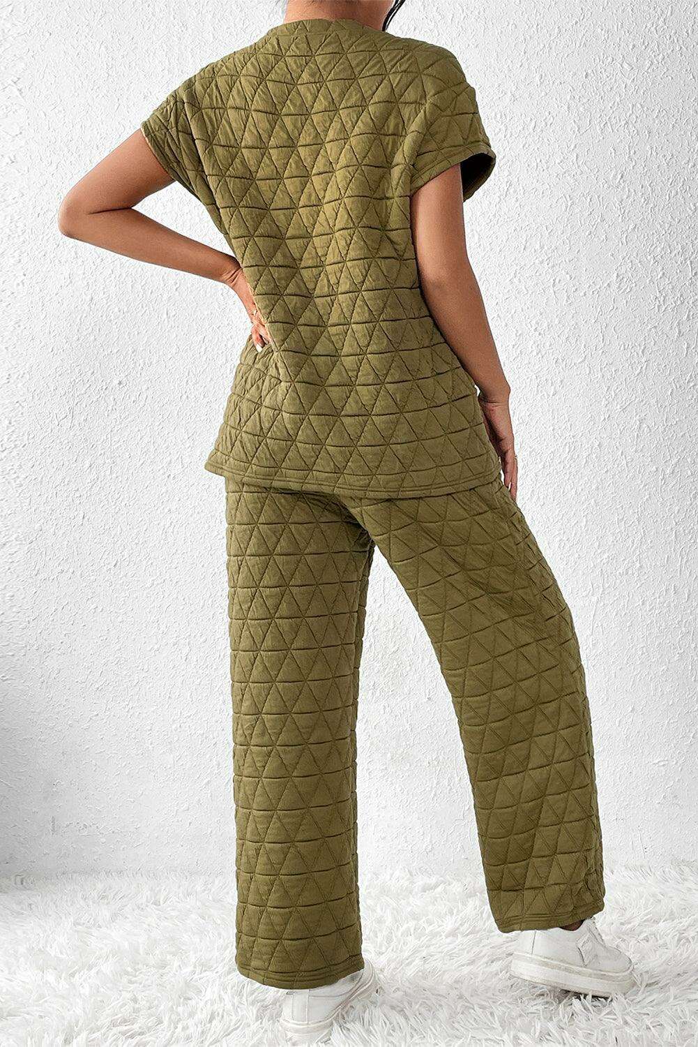세이지 그린 퀼팅 반소매 와이드 레그 팬츠 세트