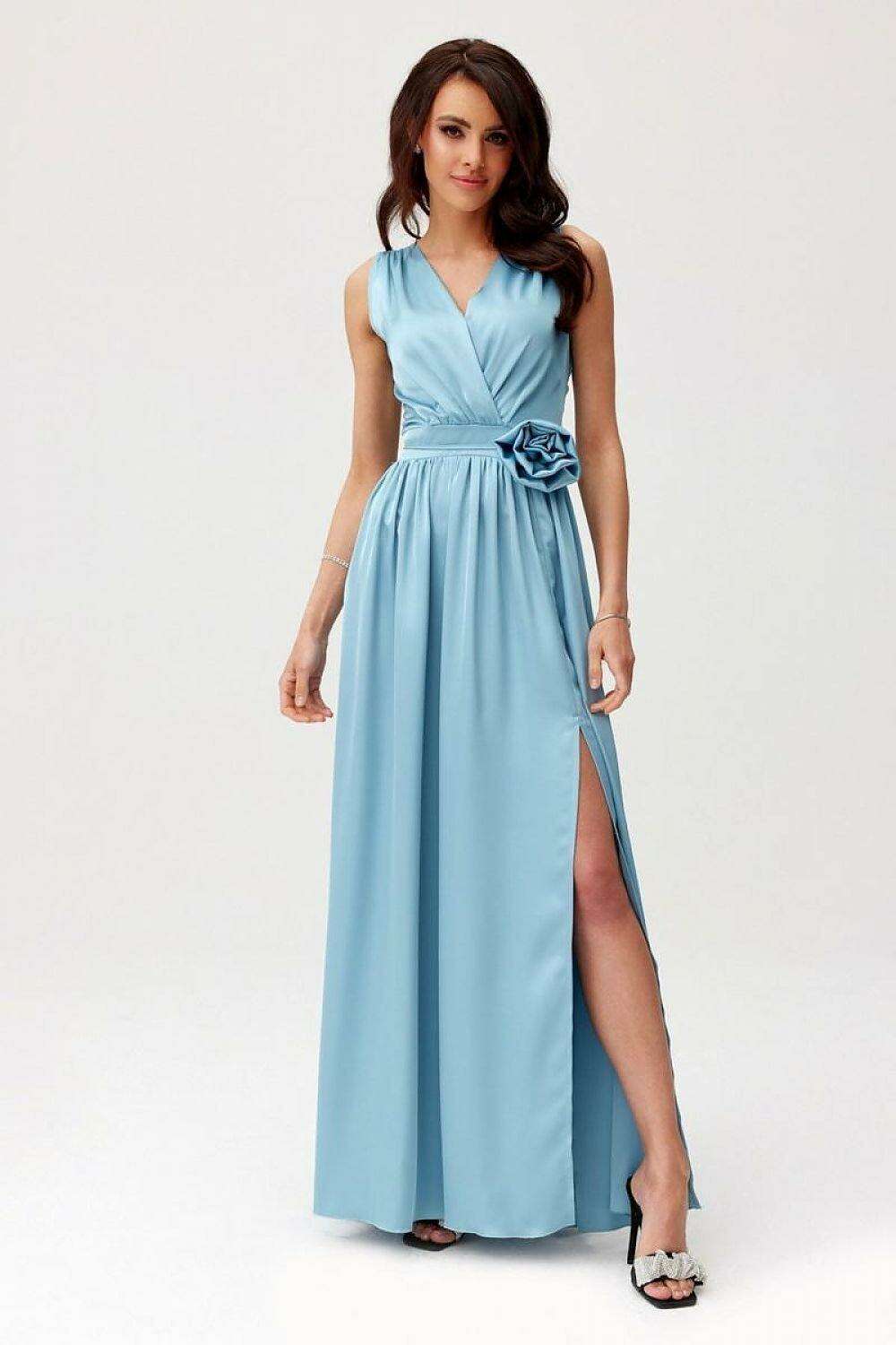Satin Maxi Dress with Rose Detail and Elegant Silhouette