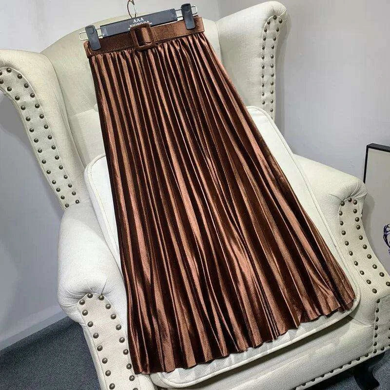 벨벳 플리츠 스커트: 하이 웨이스트, 솔리드, 코리안 시크, 가을/겨울 벨트 포함