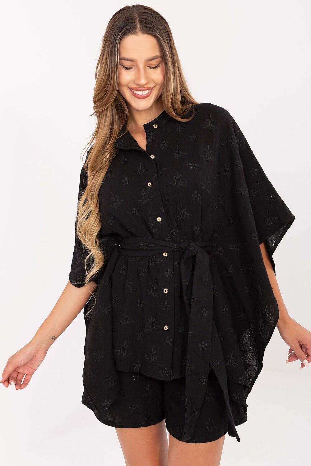 A set consisting of a shirt and shorts is an ideal proposal for everyday, comfortable stylizations. Made of natural, breathable muslin cotton with delicate embroidery on the material, which adds a subtle elegance to the whole. The shirt fastens with buttons, with a comfortable tie belt at the waist, has 3/4 sleeves and a stylish stand-up collar at the neckline, giving it lightness and a modern character. The shorts with a simple cut and high waist are equipped with practical, side slip pockets, and have a comfortable elastic waistband for a perfect fit. The whole creates a coherent and comfortable set, perfect for summer days and everyday occasions.