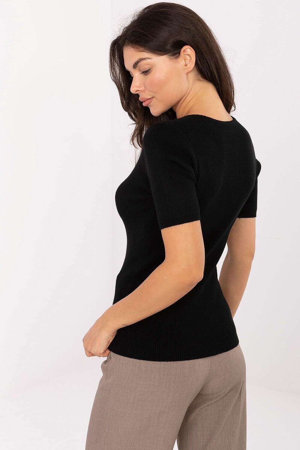 Stylish women's sweater made of a flexible blend of viscose, polyester, and polyamide, which ensures comfort and freedom of movement. The model has a standard length and short sleeves, and a V-neck subtly emphasizes the neckline. The sweater made of ribbed material, in a smooth, dominant pattern, will work great in casual, everyday, and work outfits. It is a versatile wardrobe piece that can be easily paired with jeans, skirts, or trousers.