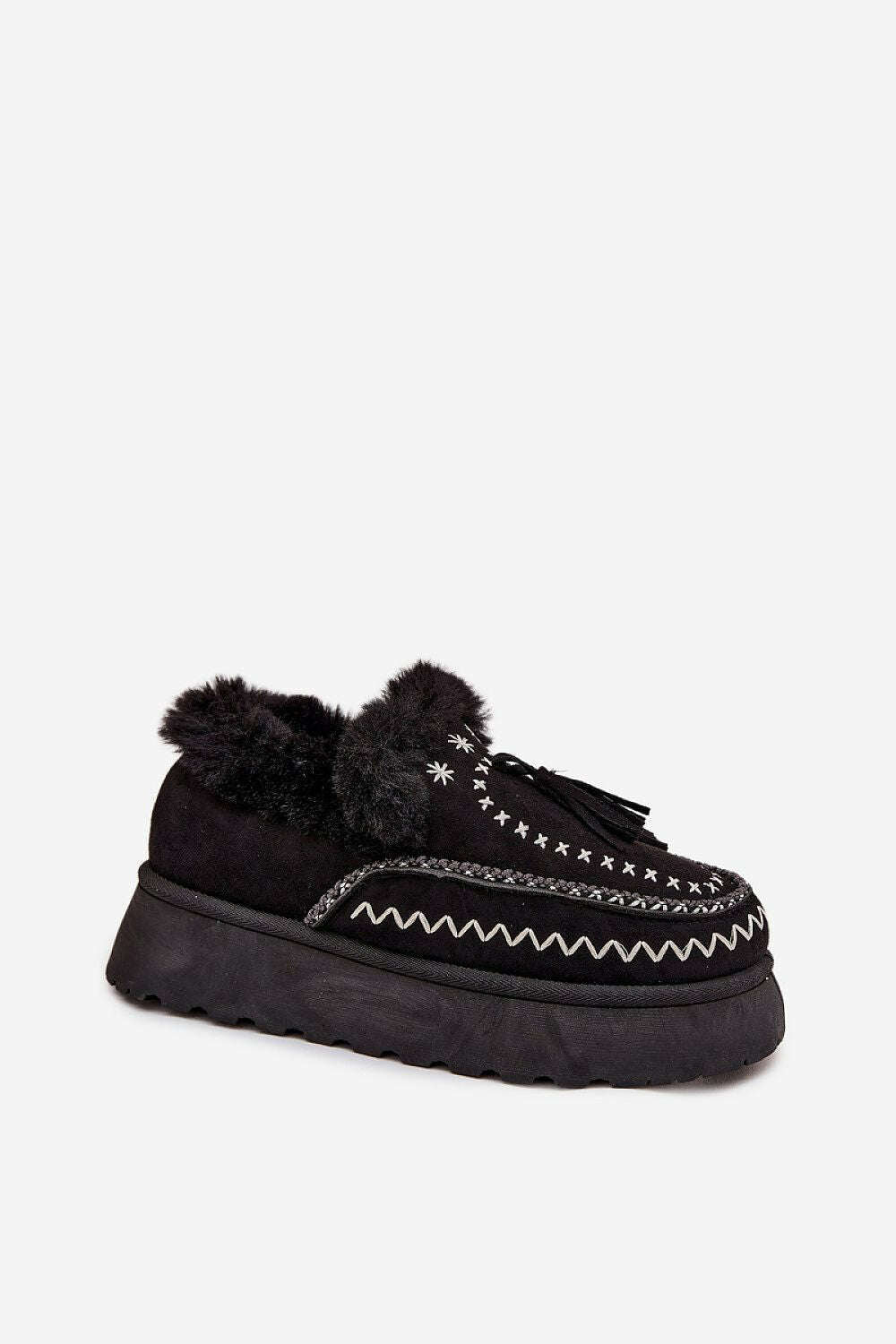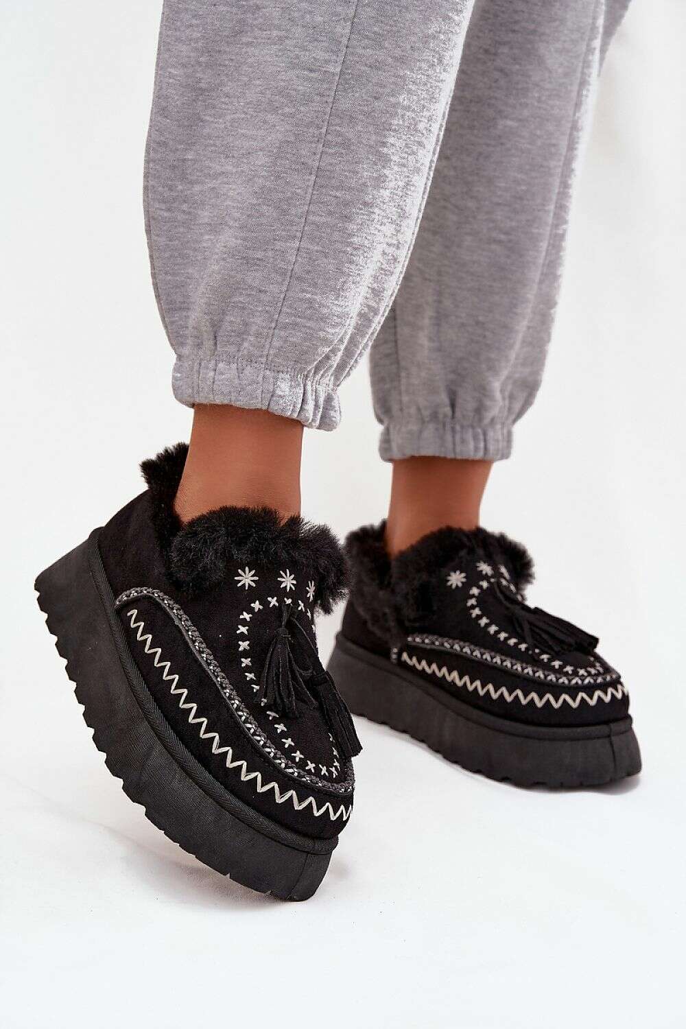 The boots are adorned with stylish details—fancy stitching, fur trim, and fringes—creating an original, on-trend silhouette that stands out in any winter outfit. Perfect for walks or everyday wear, they pair effortlessly with jeans, leggings, or skirts.