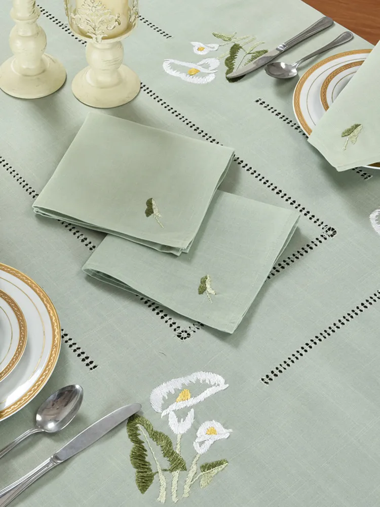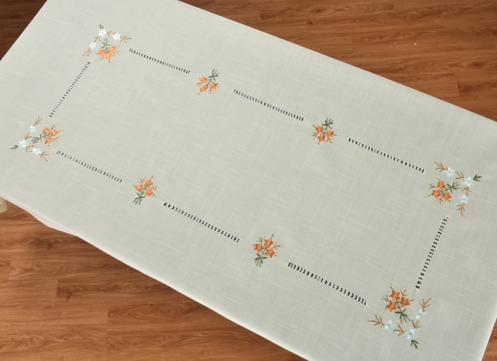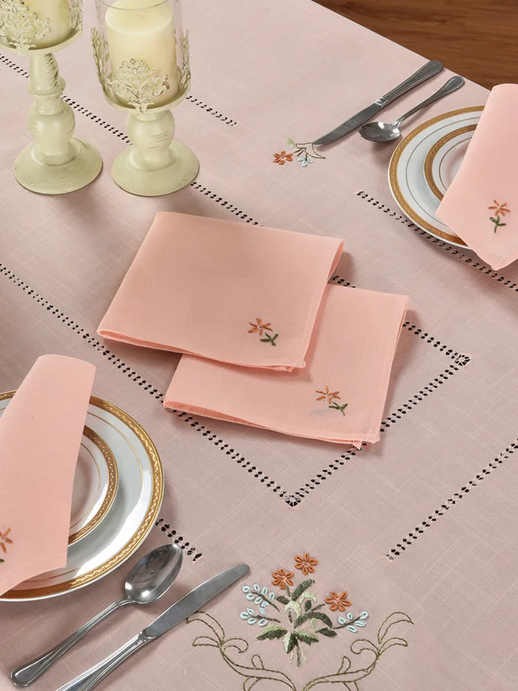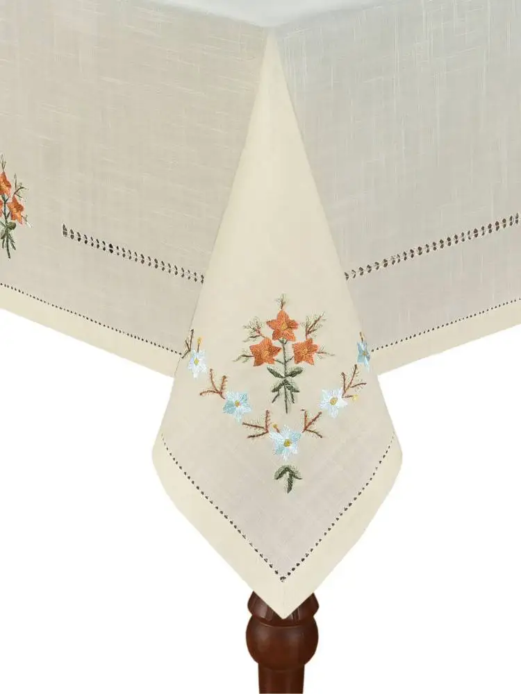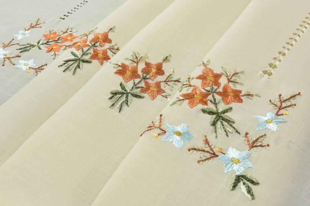 숙련된 장인이 수작업으로 제작합니다. 간결한 헴스티치로 식탁보의 프레임을 화사한 작은 꽃과 함께 화려한 스타일로 세팅했습니다.