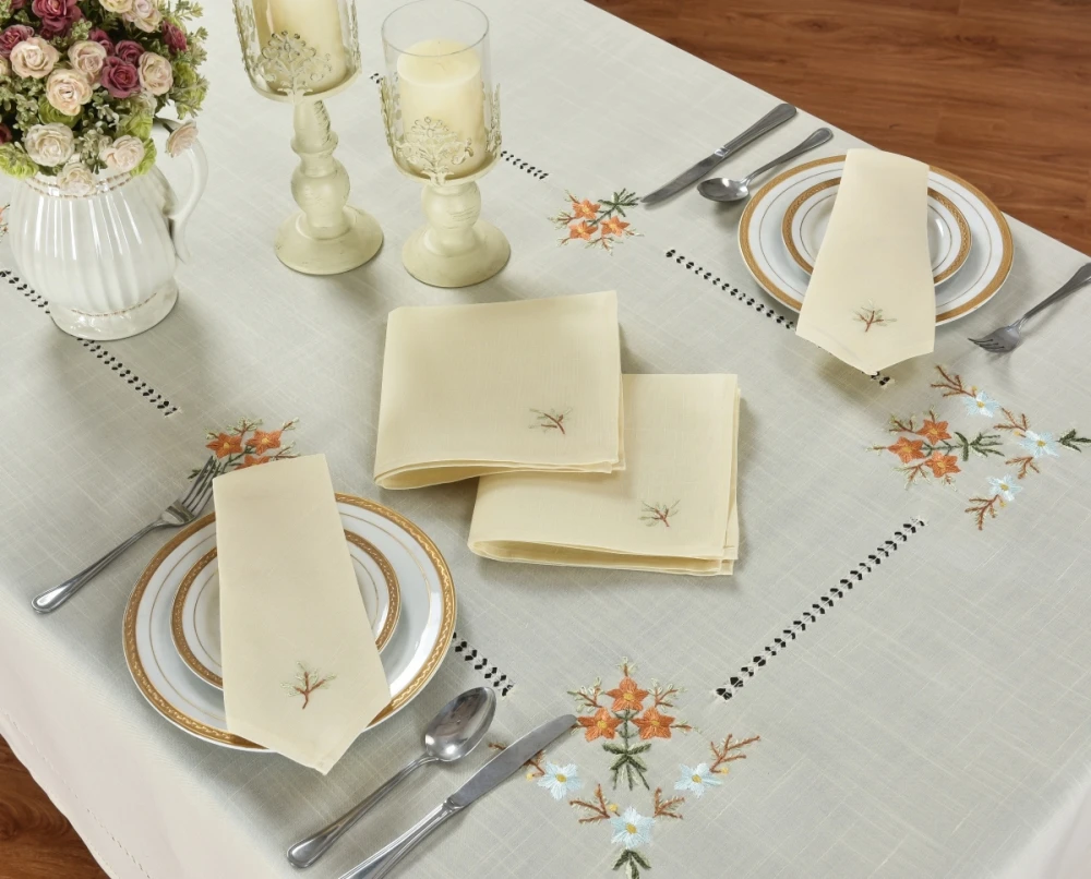 [Camellia Casa]멋진 베이지 식탁보, 손바느질 및 자수, 냅킨 8개 세트, 린넨룩, 빅사이즈, 핸드메이드