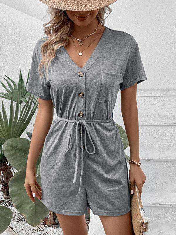 Jakoto신상 캐주얼 엘레강트 솔리드 컬러 브이넥 점프수트