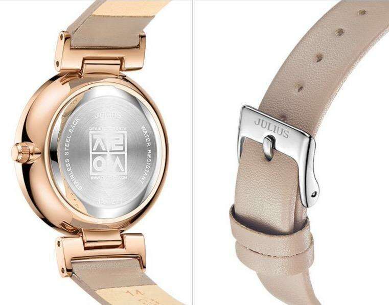The deep green leather band not only enhances the watch's elegance but also adds a unique touch to any outfit. Whether dressing up for a special occasion or simply elevating your daily attire, this watch is the ideal accessory. Choose the Elegant Deep Green Leather Strap Women's Watch by JULIUS for a perfect blend of style, durability, and accuracy that stands out in a sea of ordinary timepieces.