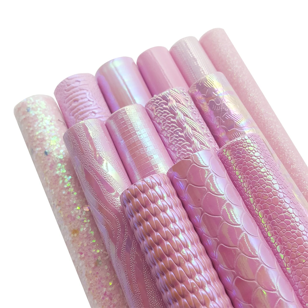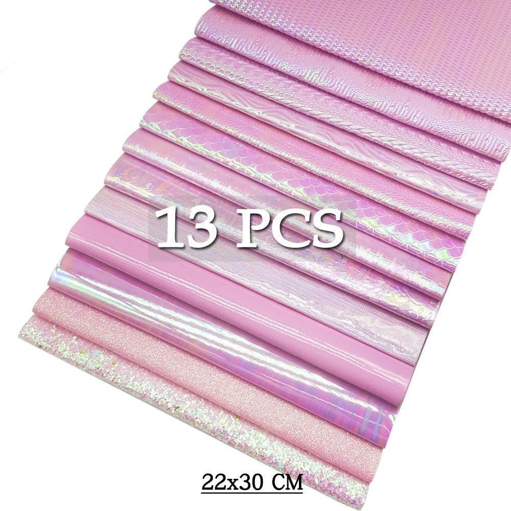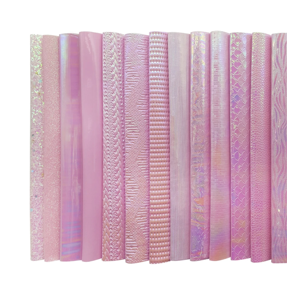 QIBU 22*30cm 13pcs 핑크 비닐 패브릭 세트 A4 크기 Chunky 반짝이 가짜 가죽 부드러운 홀로그램 패브릭 DIY 보우 가방 재료
