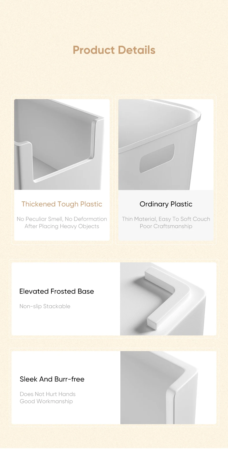 - 내구성을 위해 두꺼운 소재를 사용하여 잡화를 효율적으로 분류하고 보관할 수 있는 정리함입니다. 더 이상 어수선한 캐비닛이나 서랍을 뒤질 필요가 없습니다.