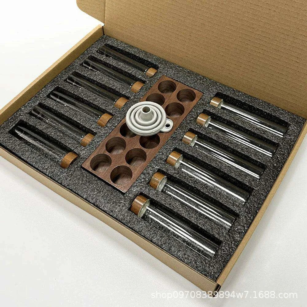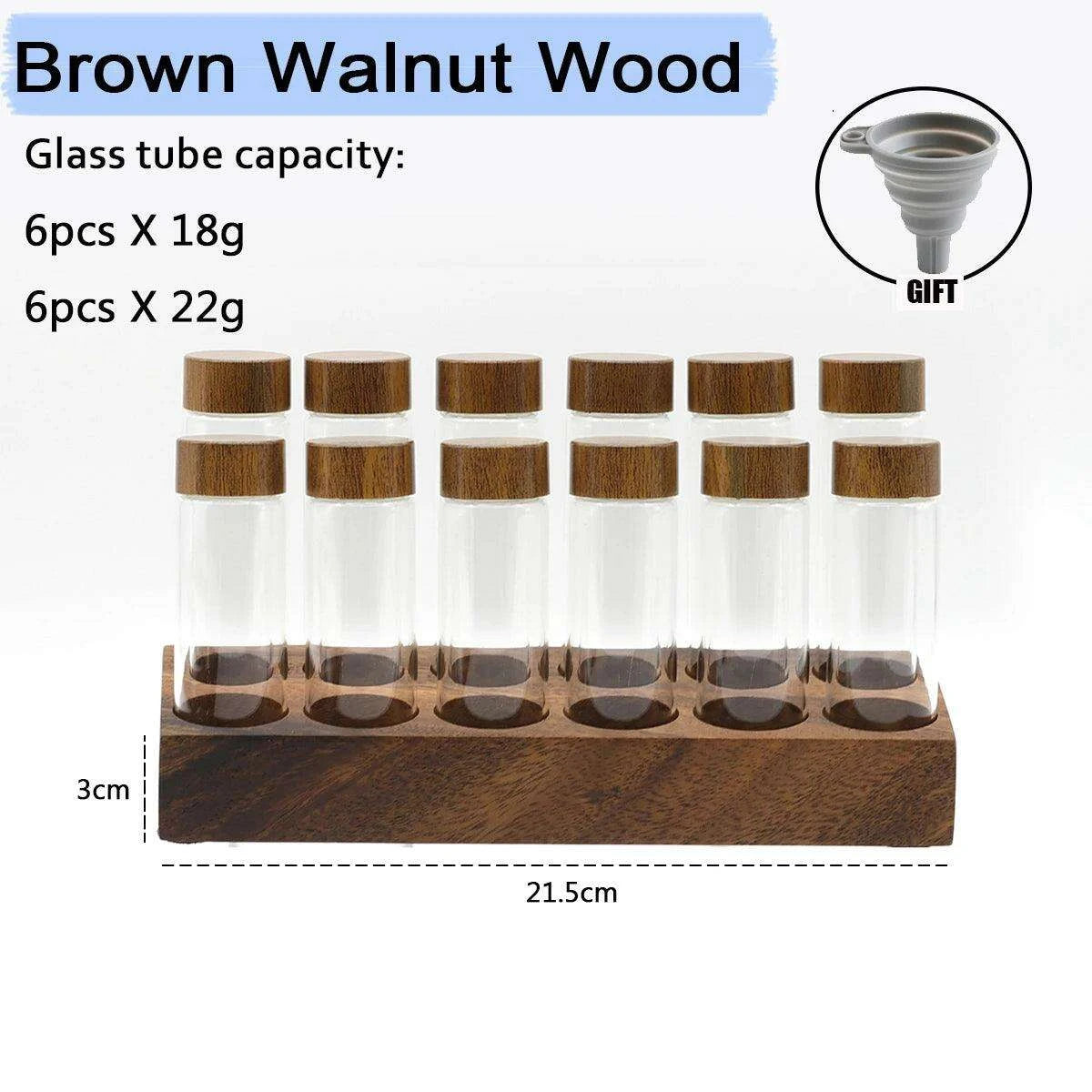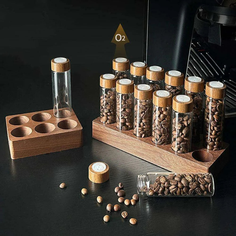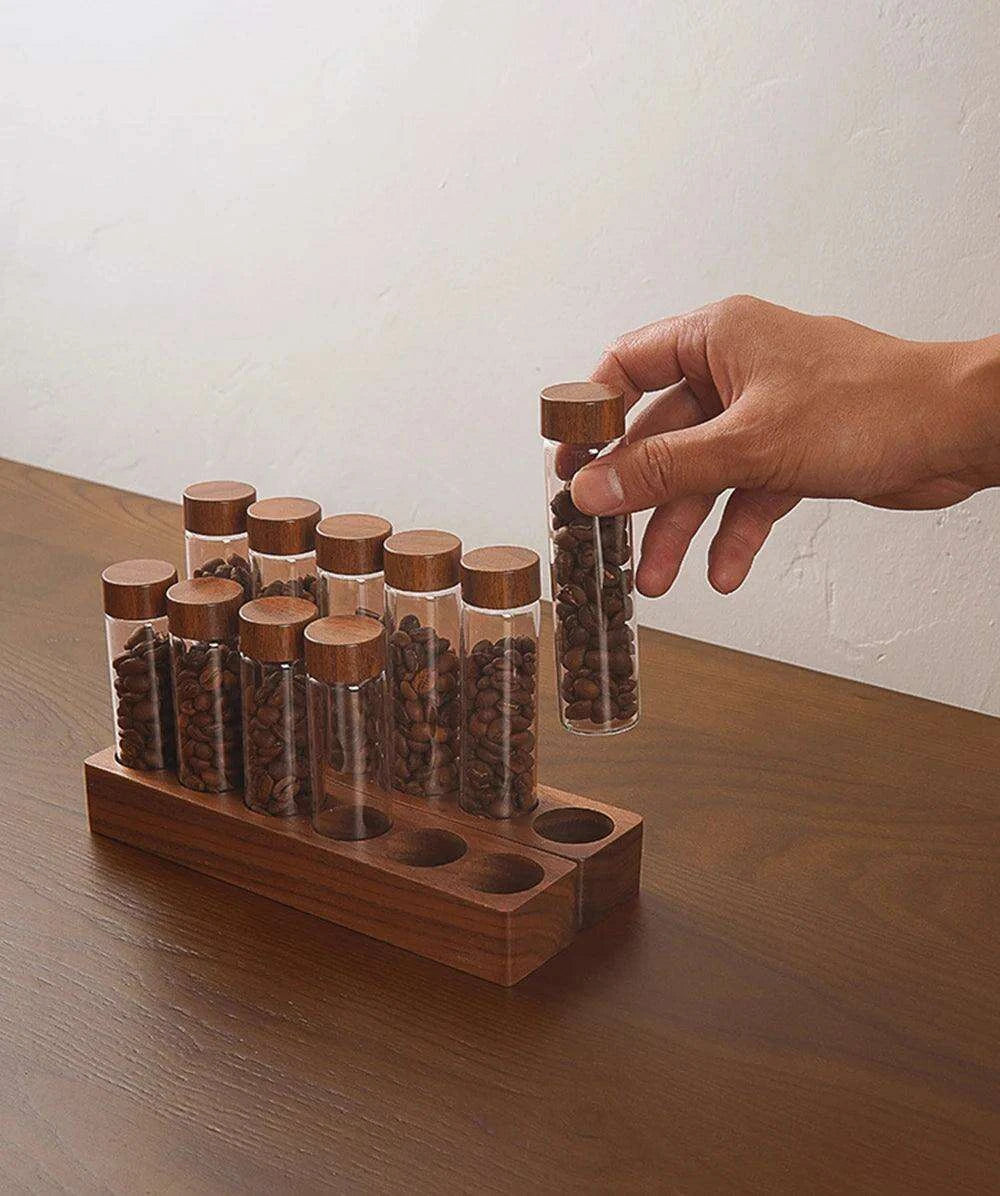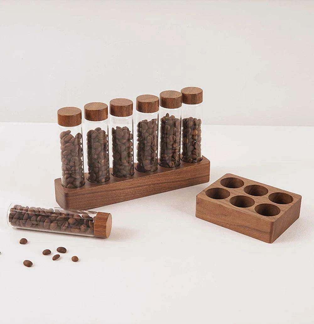 Elegant Coffee Bean Display Organizer with Glass Tubes and Walnut Base