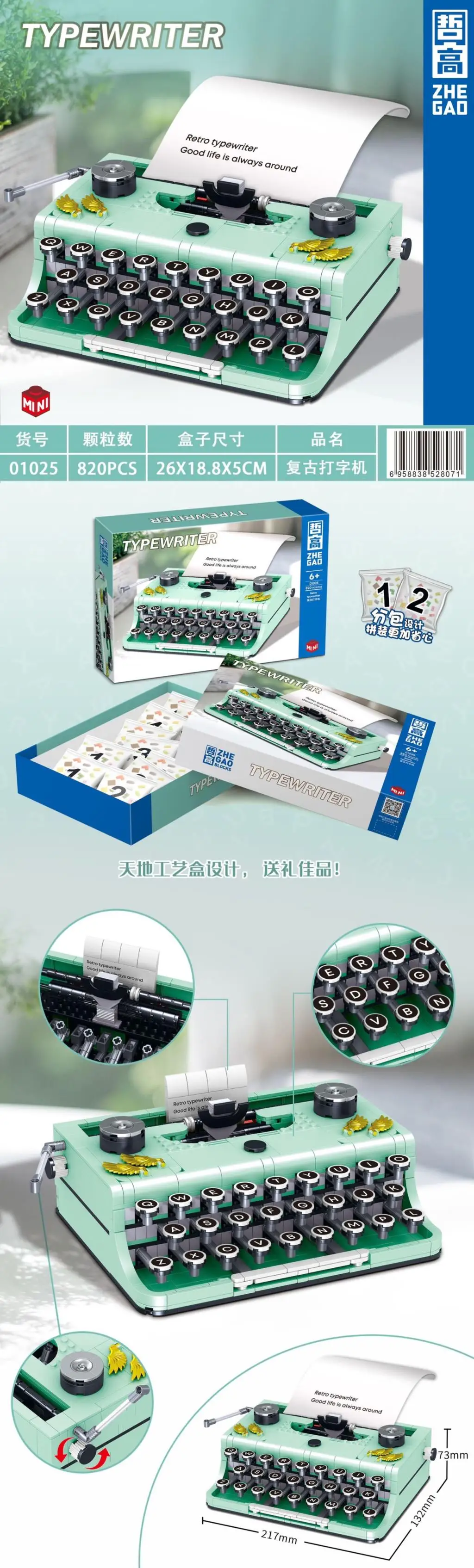 녹색 기술 전문가 레트로 타자기 프린터 모델 빌딩 블록 시뮬레이션 조립 벽돌 장난감 Diy 어린이를위한 선물 세트