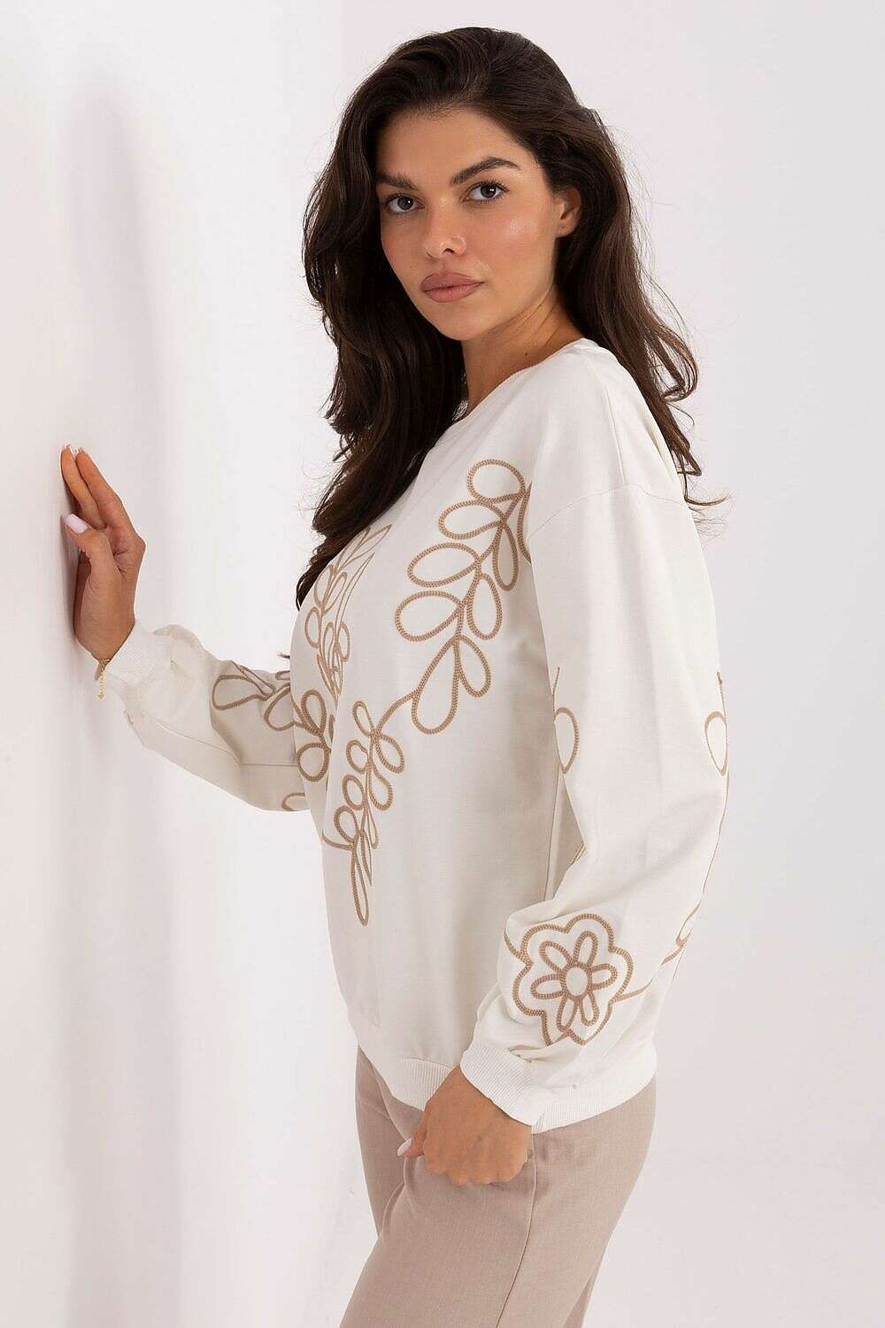 Women's casual sweatshirt, perfect for everyday occasions. Made of soft cotton with a hint of elastane, it ensures comfort and ease of wearing throughout the day. It has a standard length, classic round neckline, and long sleeves. Its charm and originality are added by subtle embroidery placed on the front and sleeves. This is a versatile model that will work great in everyday stylizations both for work and leisure time.