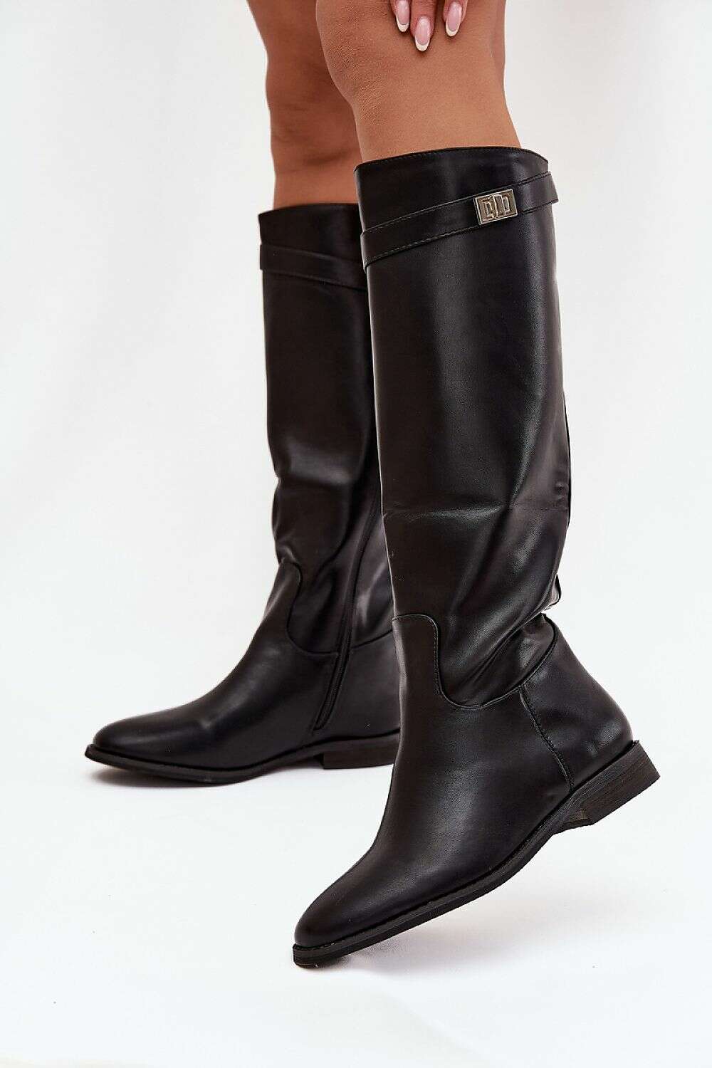 Stylish women's boots made of eco leather are a perfect choice for cooler days. Set on a flat heel, they guarantee comfort and convenience during everyday wear. Their classic, rounded toes give them a versatile character, and the insulation inside the boot provides warmth. The boots are fastened with a practical zipper, which makes them easy to put on. At the top of the shaft there is a strap with a decorative detail, adding elegance and a fashionable accent to the whole. A model perfect for both pants and dresses.