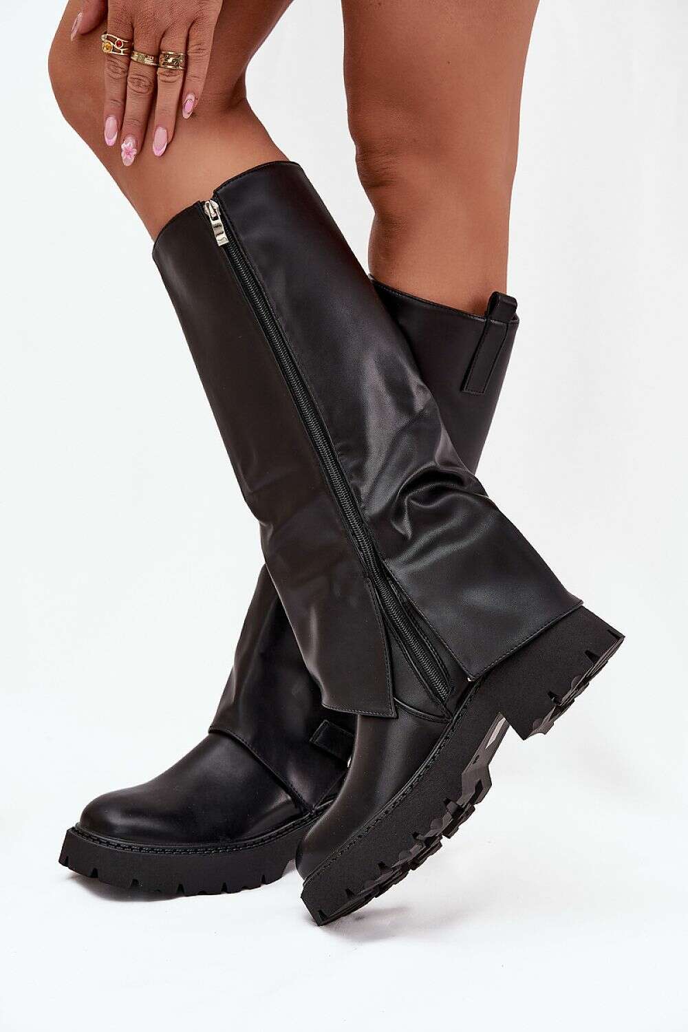 Fashionable, women's knee-high boots made of eco leather are a must-have for colder days. Set on a platform and a flat heel, they provide stability and comfort with every step. The turned-down shaft decorated with a strap with a buckle is the main advantage of this model, adding character to it. The toes are rounded, and the interior is lined with a shoe lining, which guarantees warmth. Fastened with a zipper, these boots go great with autumn-winter stylizations. Definitely worth having them in your wardrobe!