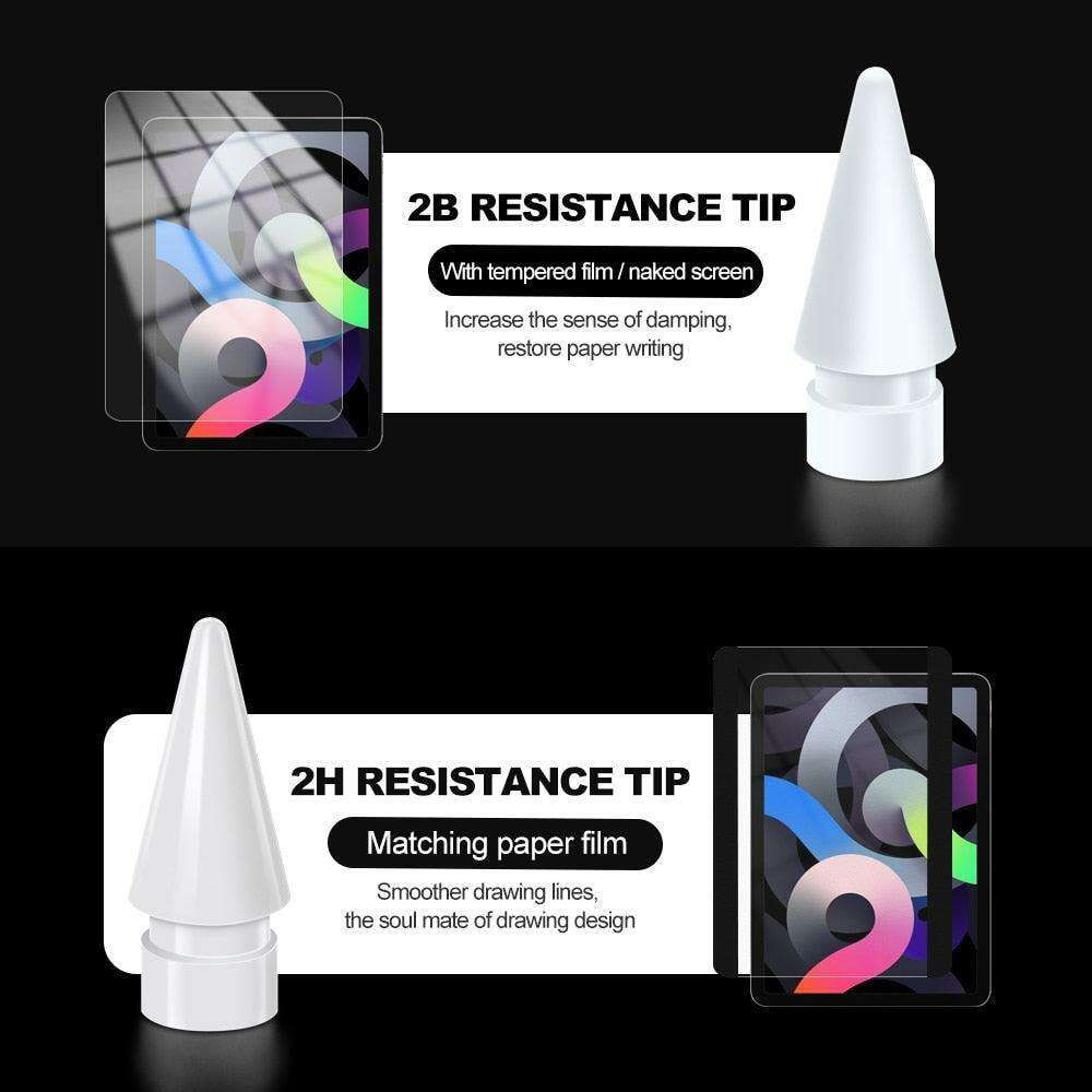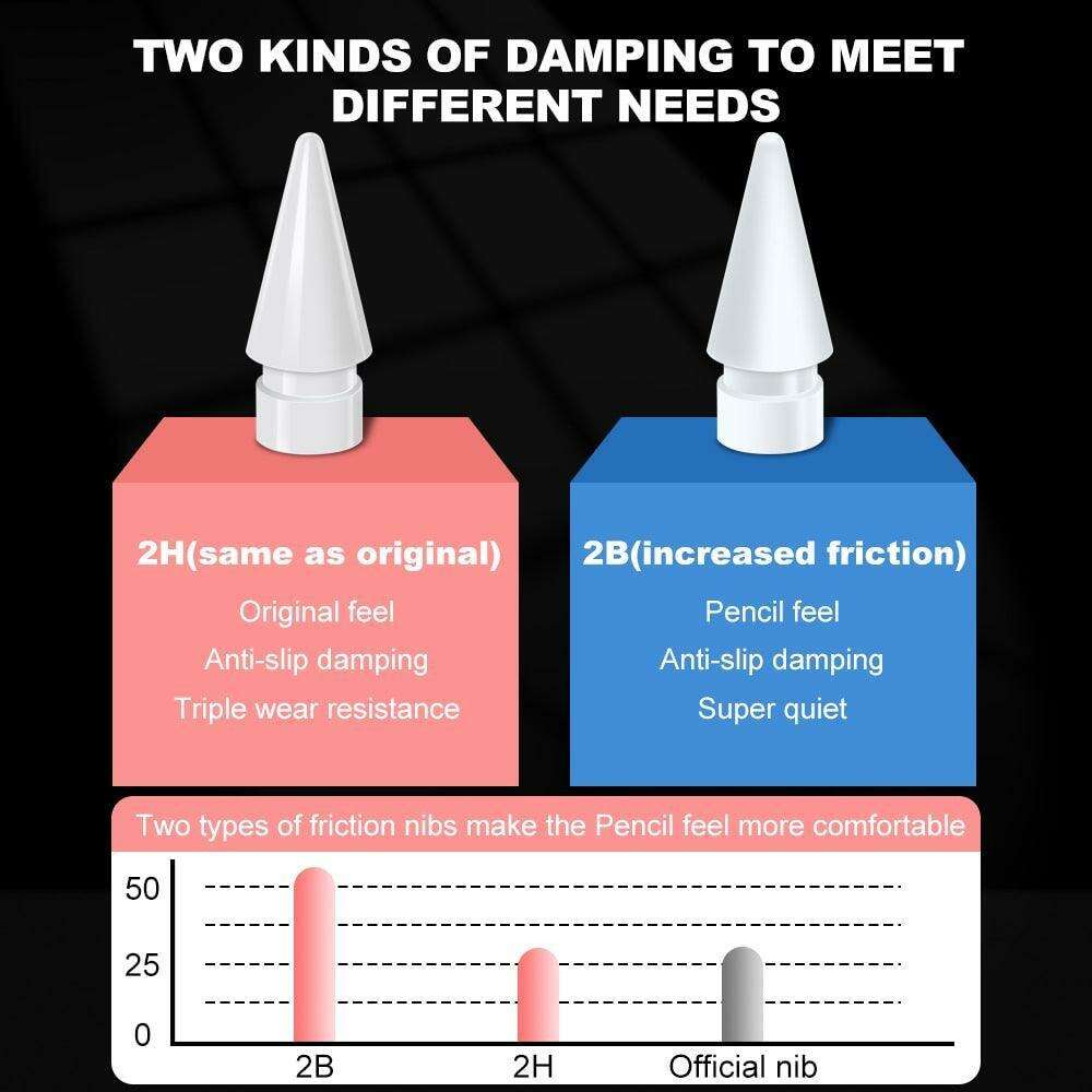 - 더블 레이어 2B 및 2H 교체 펜촉으로 Apple Pencil을 업그레이드하세요. 이 펜촉은 보다 편안한 쓰기 및 그리기 경험을 위해 두 가지 유형의 마찰을 제공합니다.