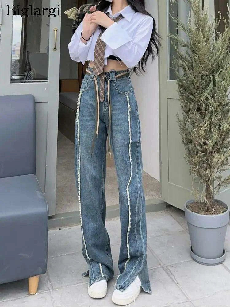 Chic Korean-Inspired High Waist Fringe Patchwork Split Trousers for Women