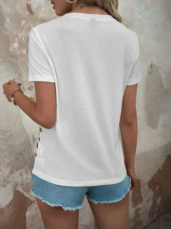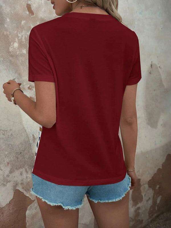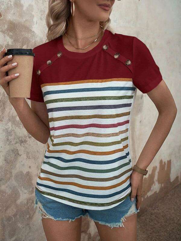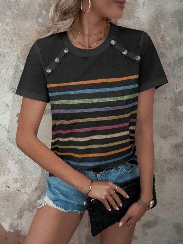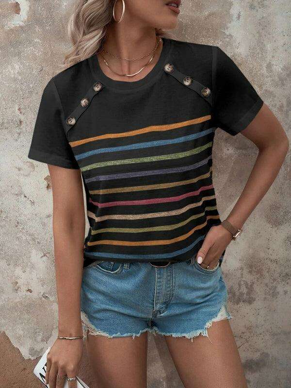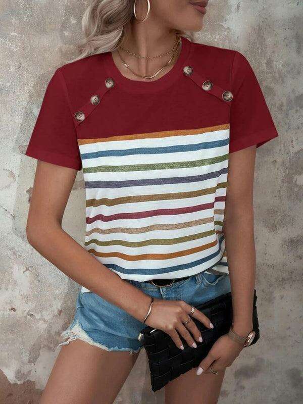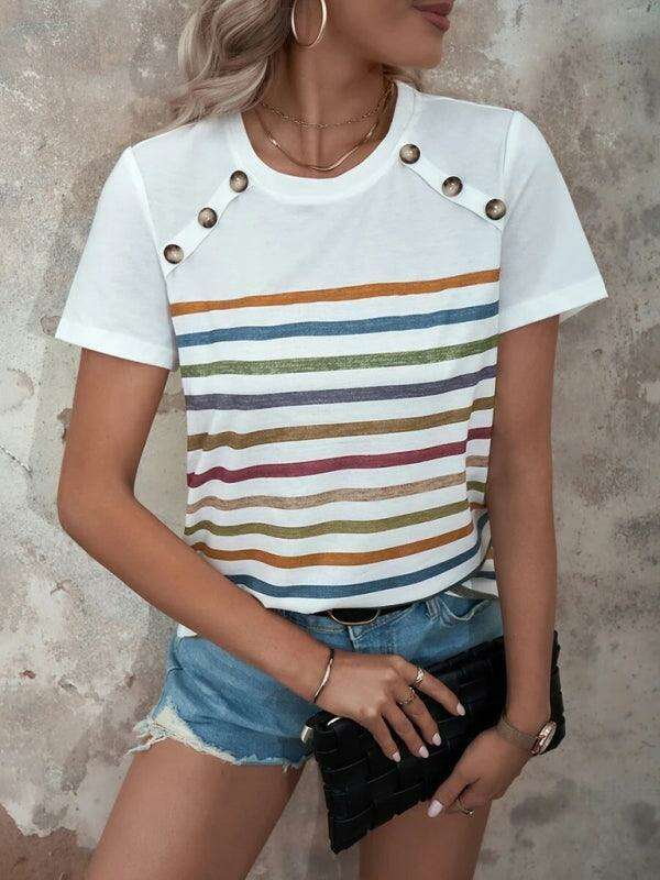여성용 스트라이프 프린트 버튼 반팔 캐주얼 탑
