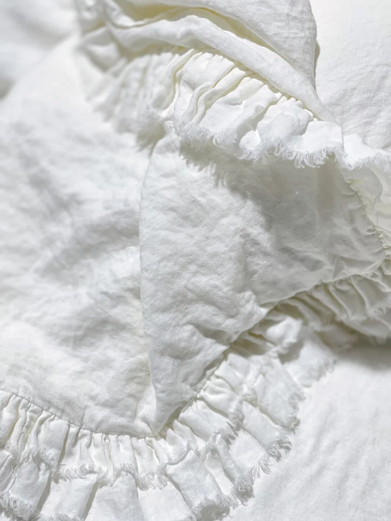 - 관리 지침: 러플의 매력을 유지하려면 린넨 베개 샴을 뒤집어서 세탁하세요. 세탁기로 세탁할 수 있으며 단독으로 세탁하거나 비슷한 색상으로 세탁할 수 있습니다. 주름은 리넨의 매력 중 하나이므로 다림질은 선택 사항입니다. 리넨은 세탁할 때마다 부드러워집니다.