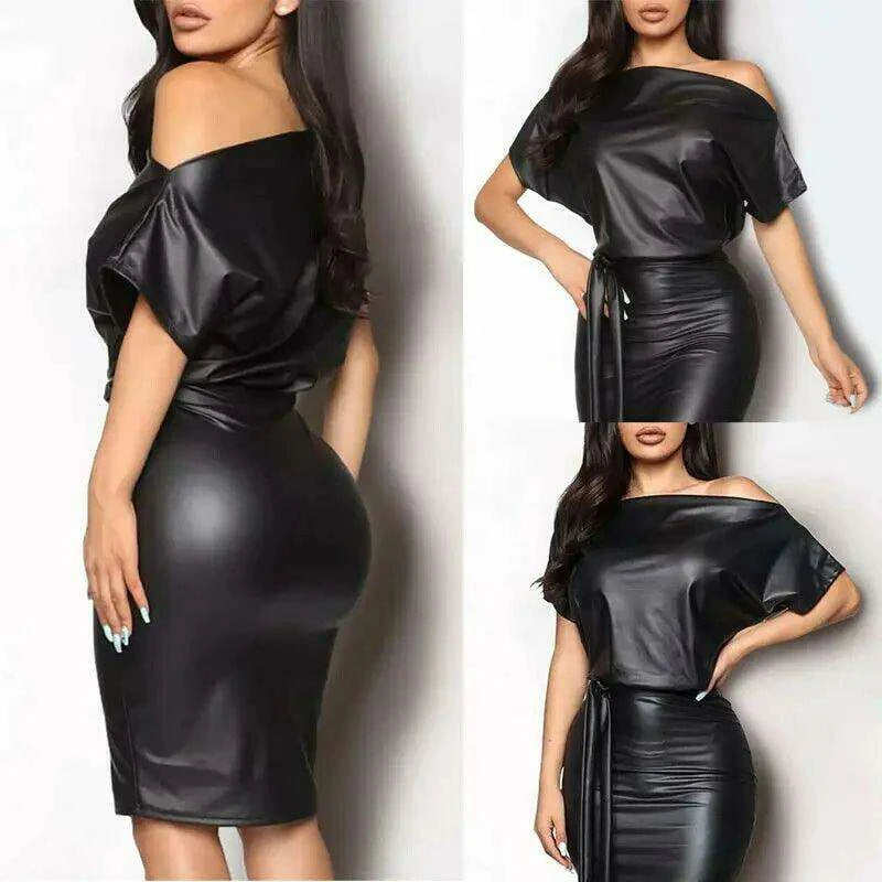 Women’s Sexy Black PU Leather Off-Shoulder Bodycon Dress with Batwing Sleeves