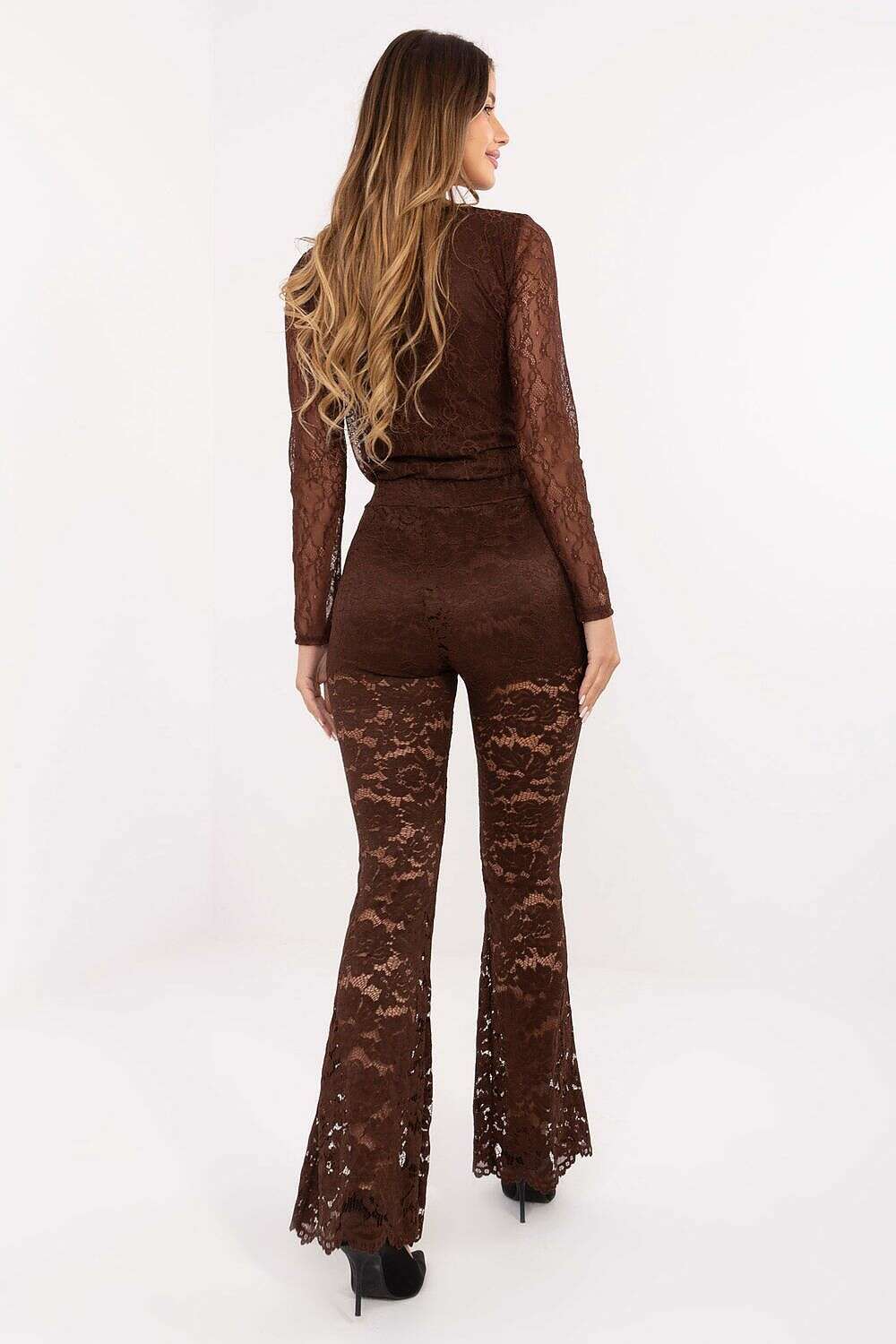 Women Lace Bell Bottom Pants with a high waist and an elastic band blend sophistication with feminine charm. Made from a lightweight polyester-elastane-viscose blend, these pants feel soft to the touch and move with you for all-day comfort. The entire garment is crafted in delicate lace, with a lining in the upper part to provide comfort and discreet coverage while preserving an elegant, refined look.